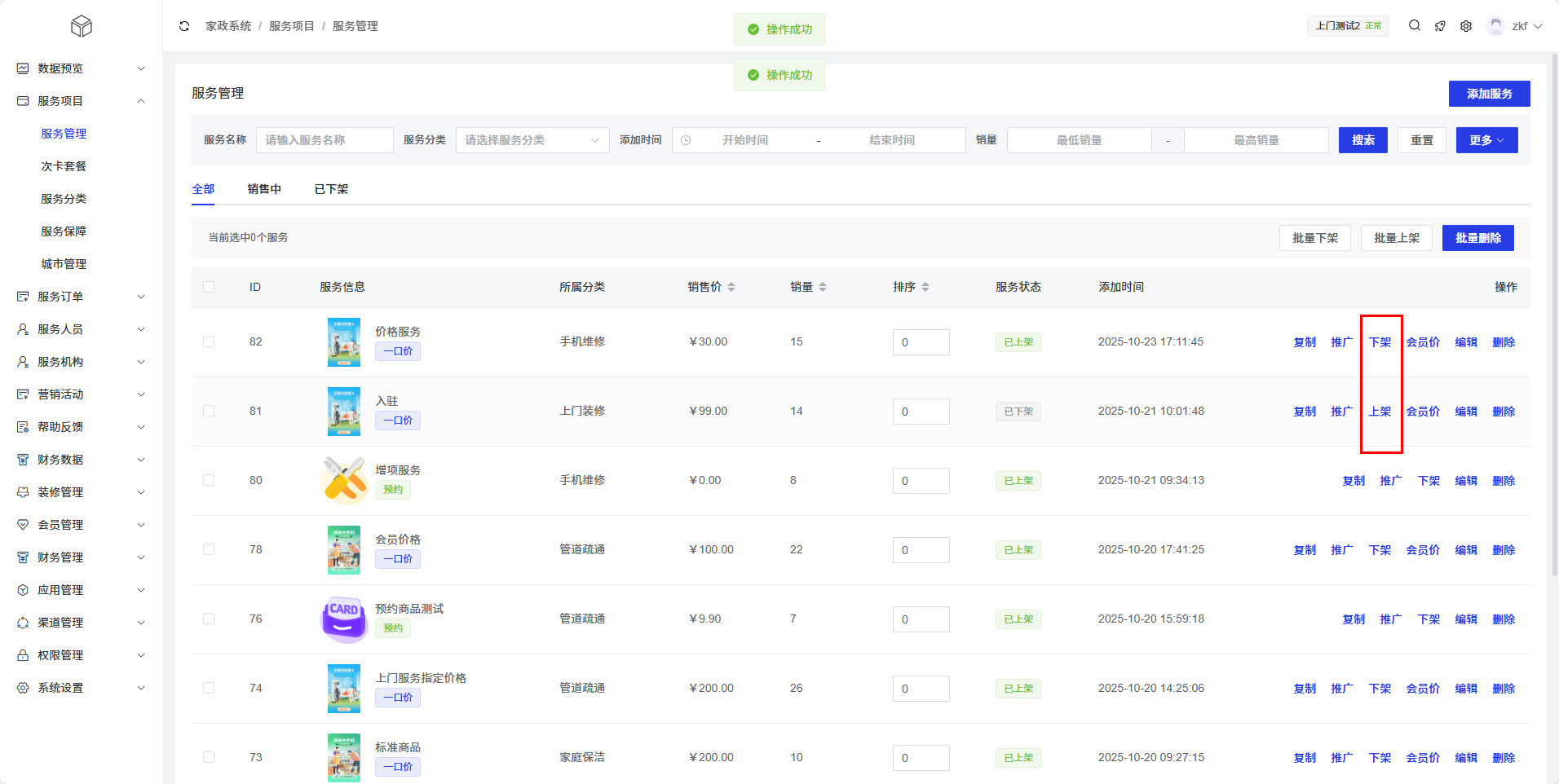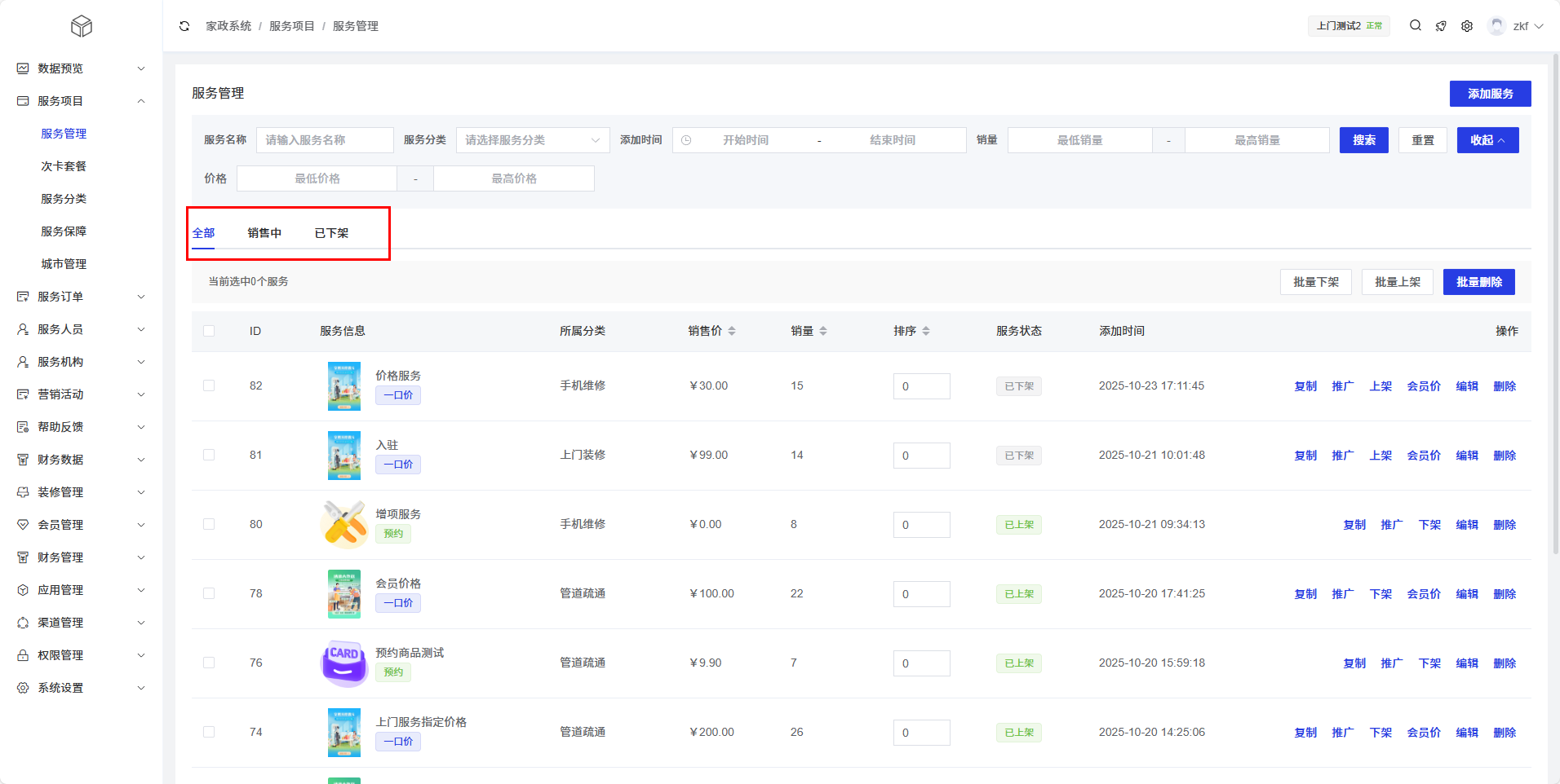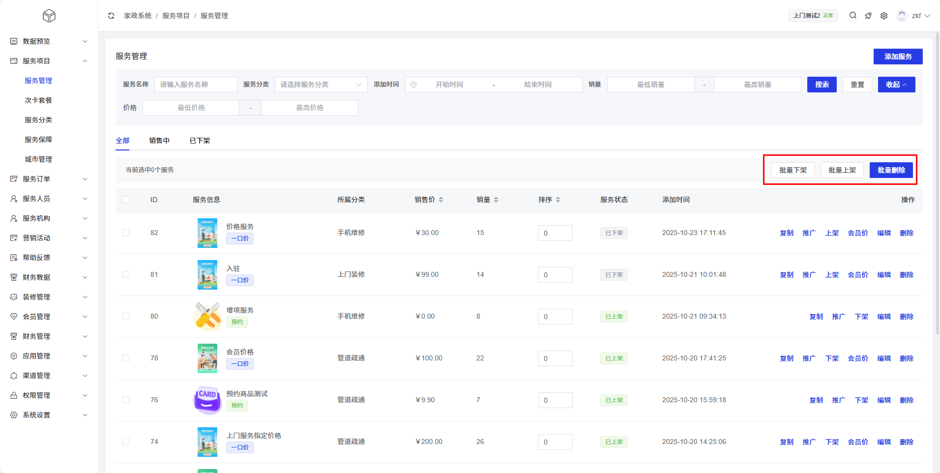 批量下架:将销售中的服务批量下架