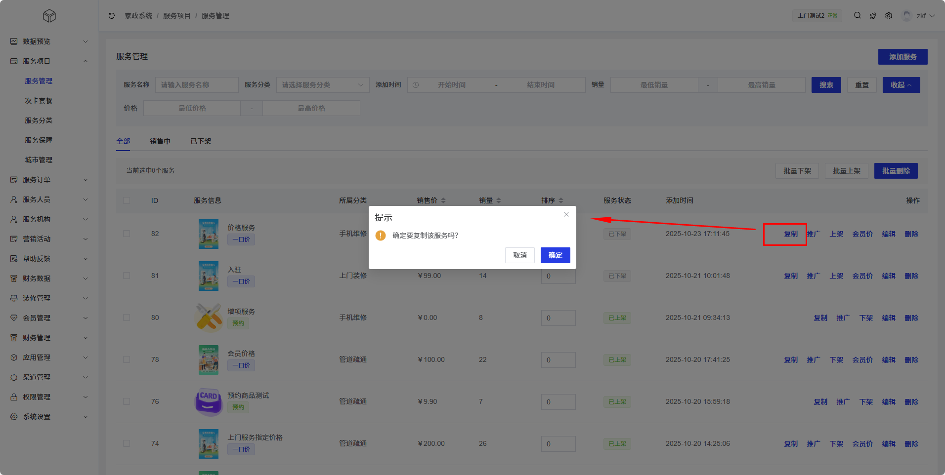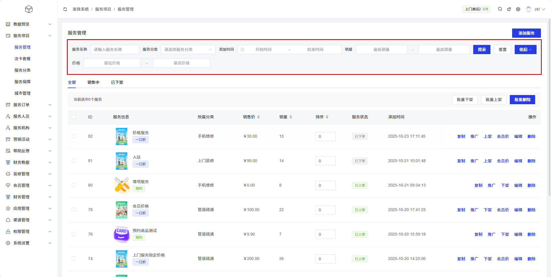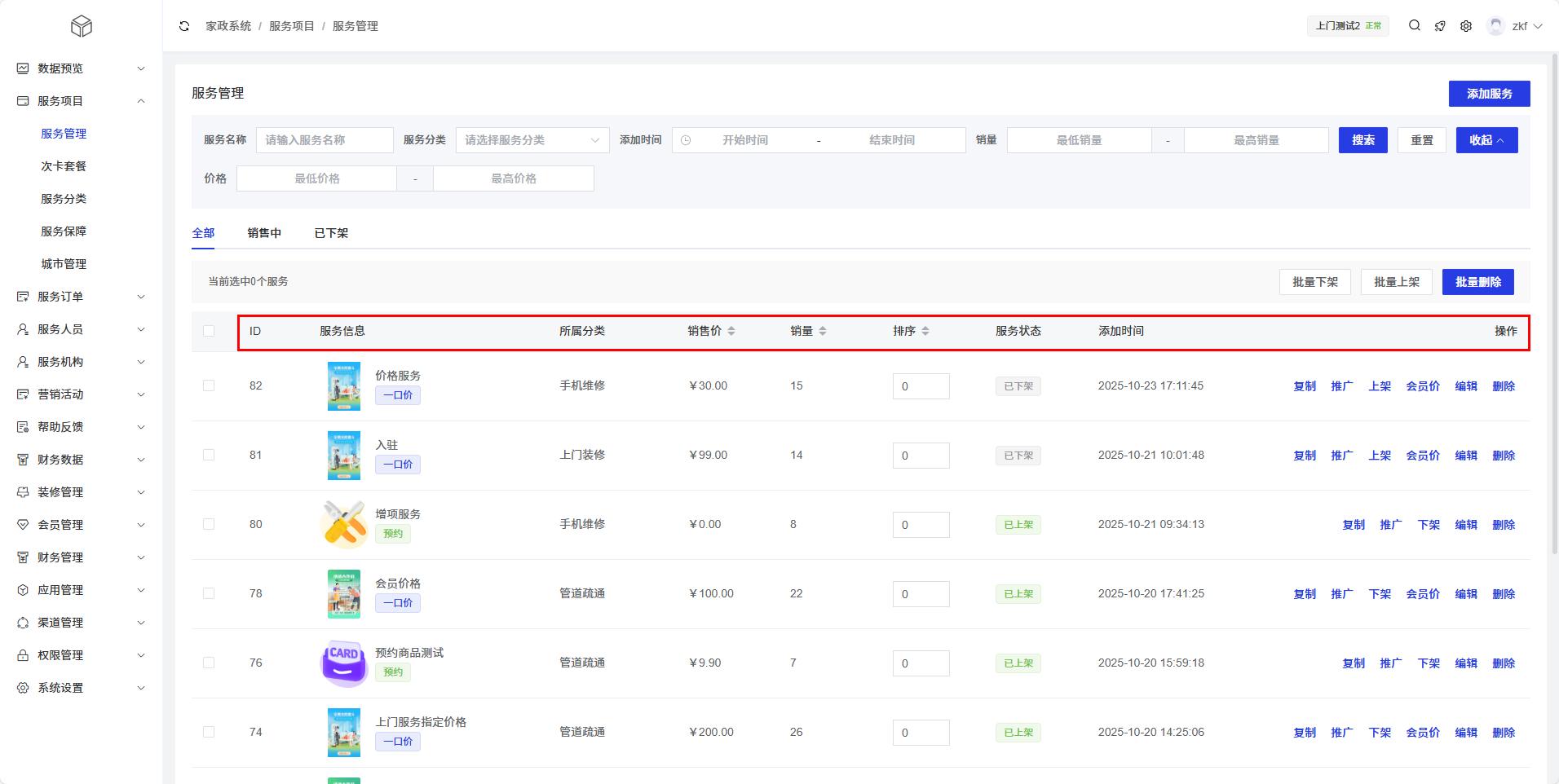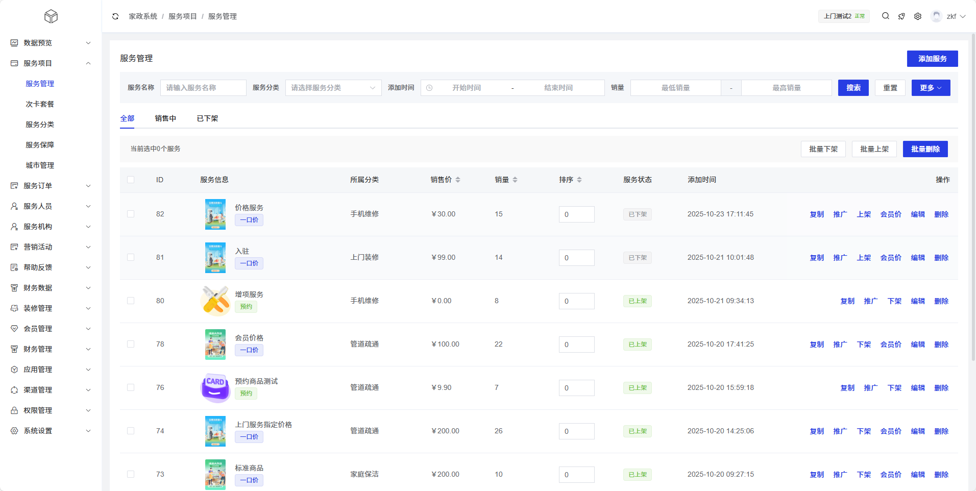 服务列表以表格形式展示了所有服务项目的基本信息,支持搜索、筛选和批量操作。