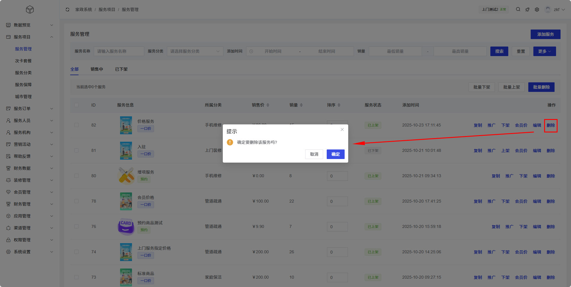 服务管理模块提供了服务删除功能,为了防止误操作,系统会弹出确认对话框要求管理员确认删除操作。