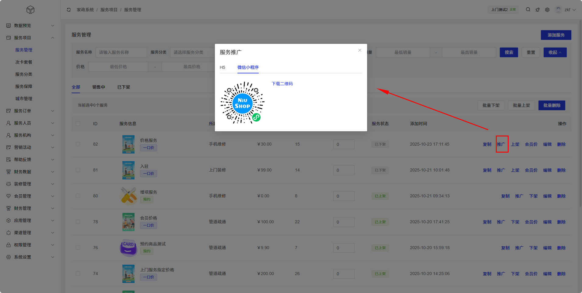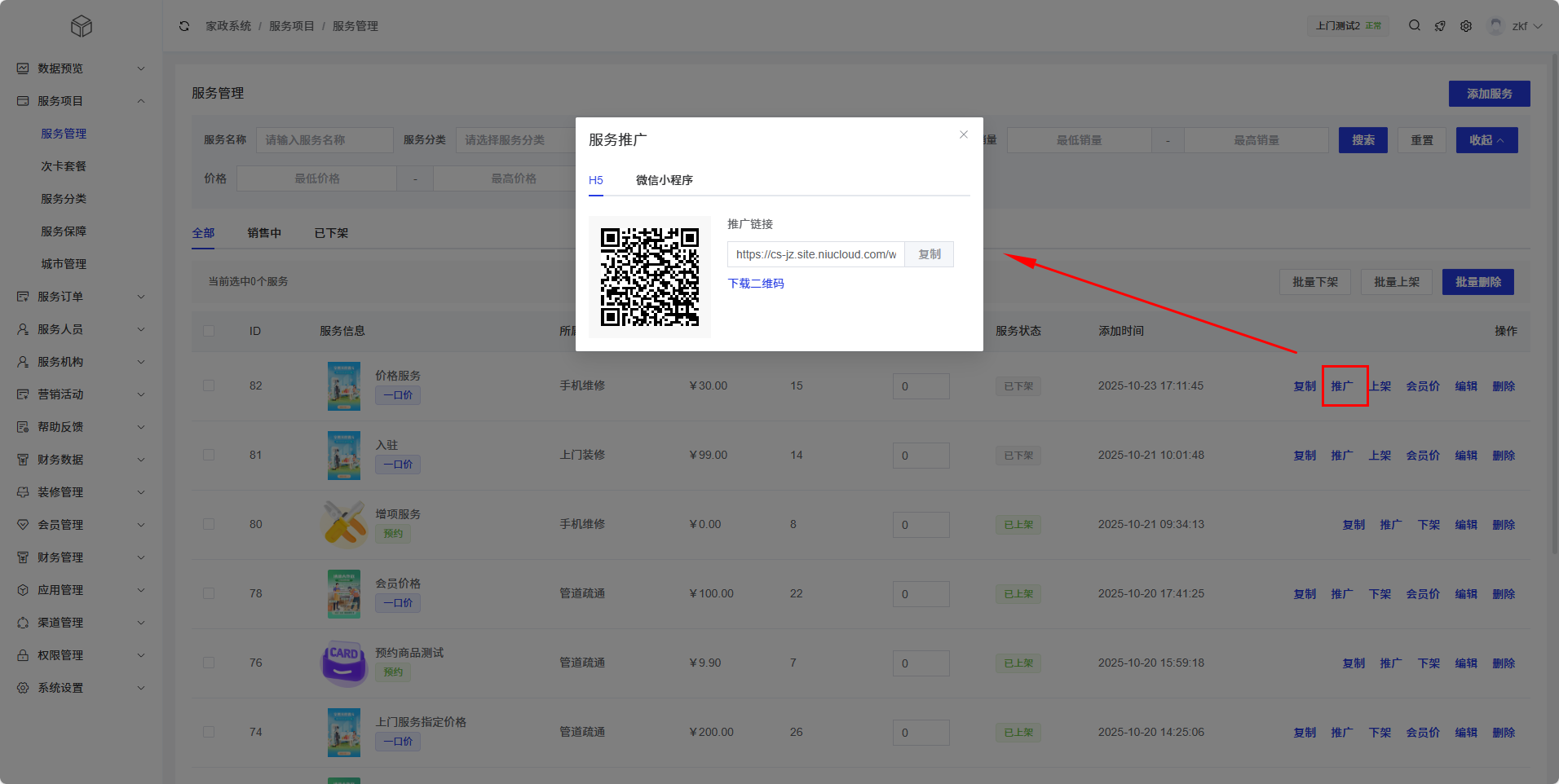 二维码推广:生成H5端服务专属二维码,客户扫描后可直接查看服务详情