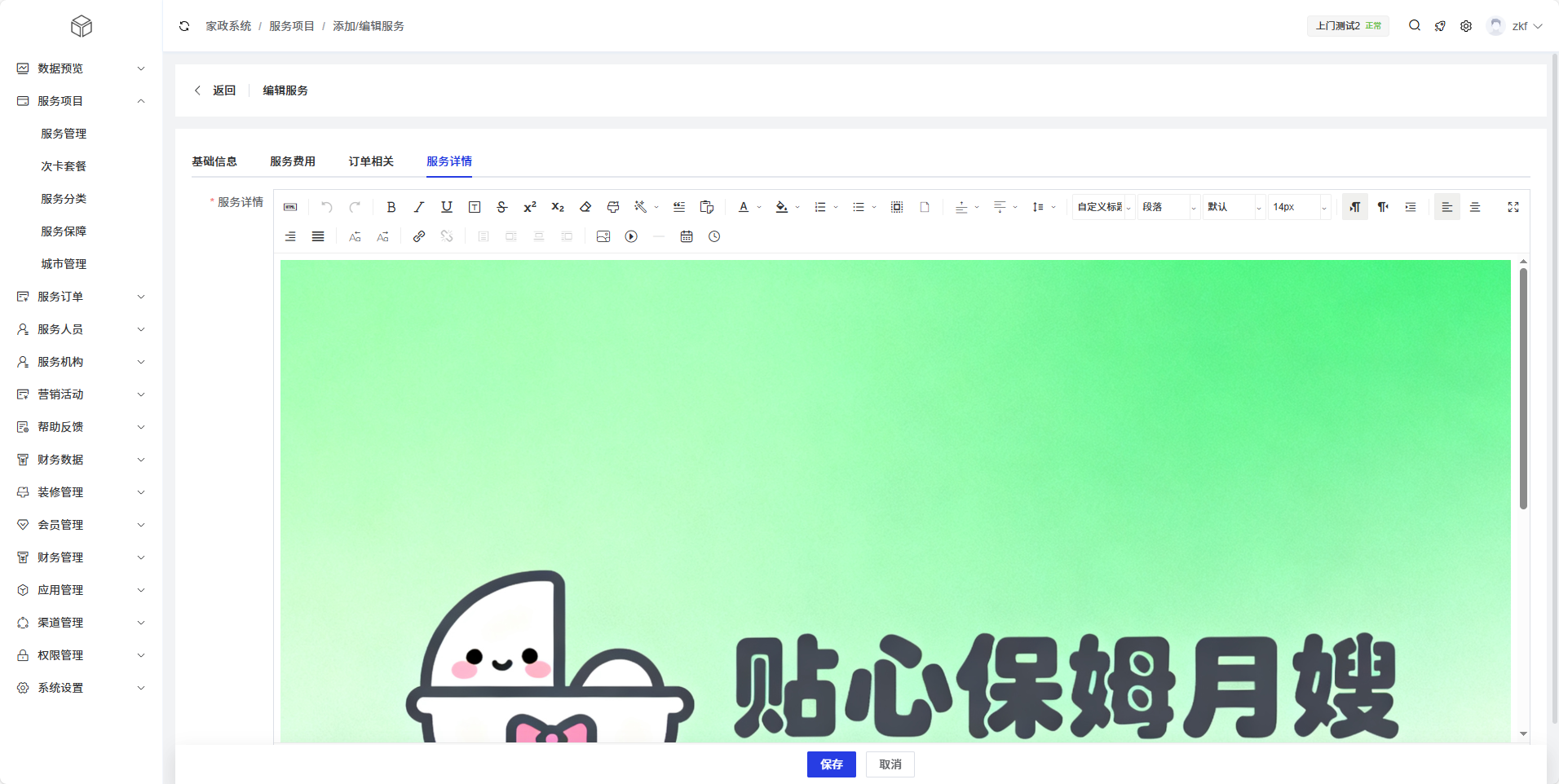 提供富文本编辑器,用于编辑服务的详细介绍、服务流程、注意事项等内容,支持图文混排。
