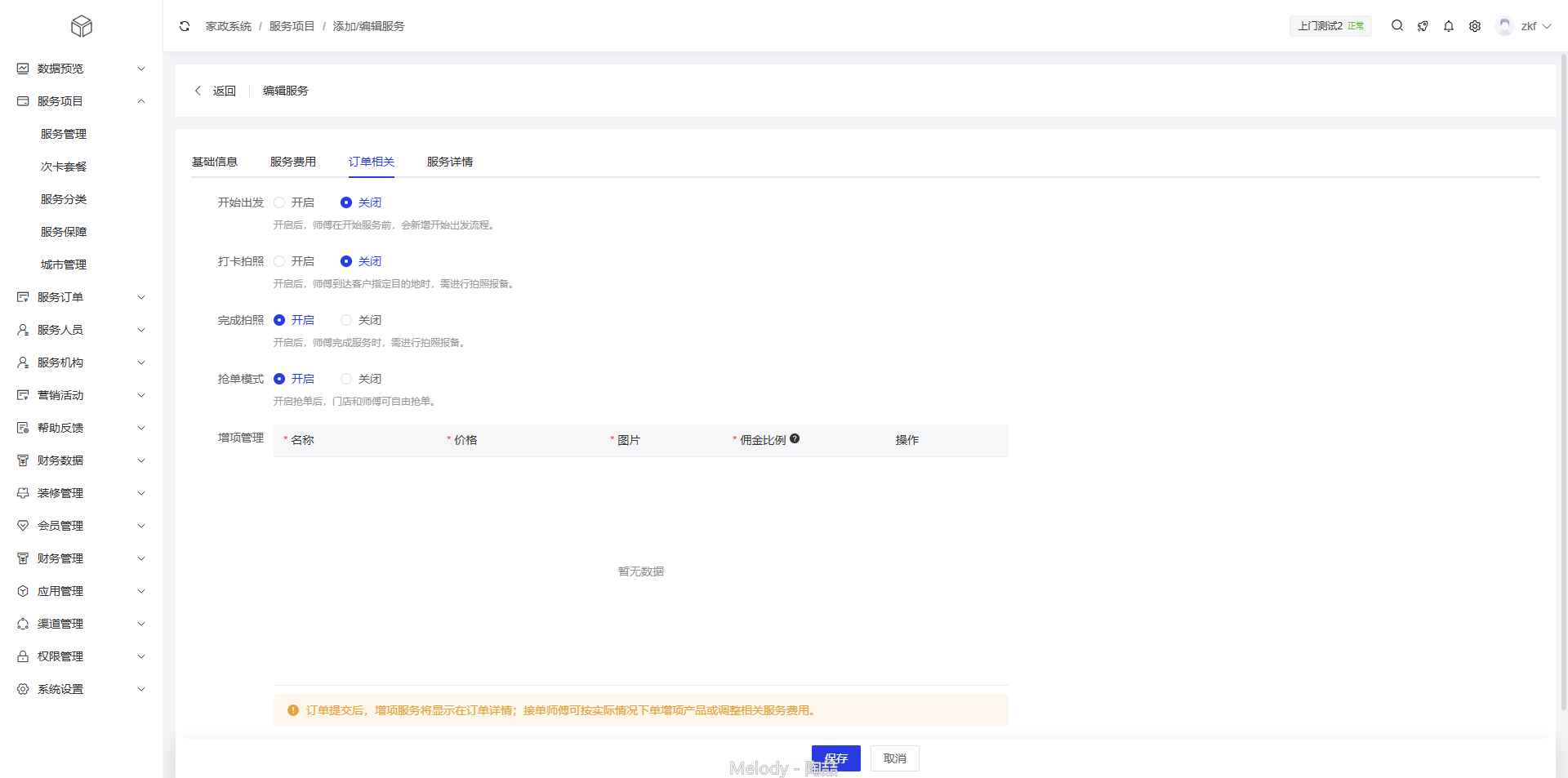 增项管理:订单提交后,增项服务将显示在订单详情。接单师傅可按实际情况下单增项产品或调整相关服务费用。