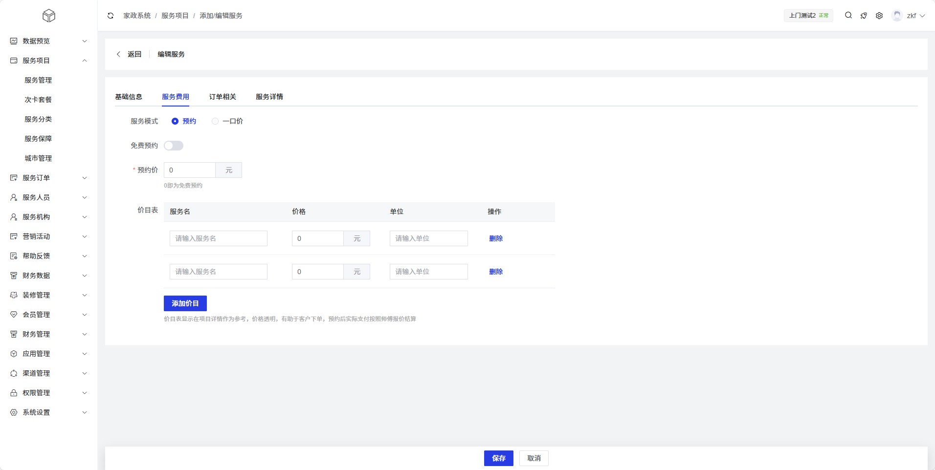 添加价目:点击按钮可新增服务项目的价目