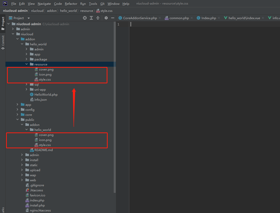 pulbic/addon/hello_world下。如果没有这个目录,需要手工创建。在hello_world(插件名)下创建子目录也是可行的。插件中,必须通过下面的方法调用资源文件addon_resource( "hello_world", "style.css");这样就可以调用资源文件了。 - 插件开发完成,必须把该目录下的所有文件拷贝到hello_world插件的resouce 目录下面