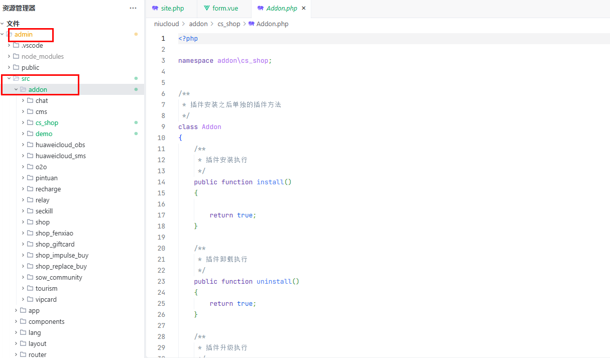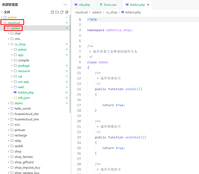 新建插件后生成的未安装插件,代码会放在niucloud/addon/插件名称目录下。