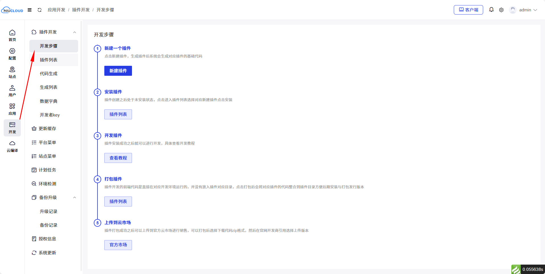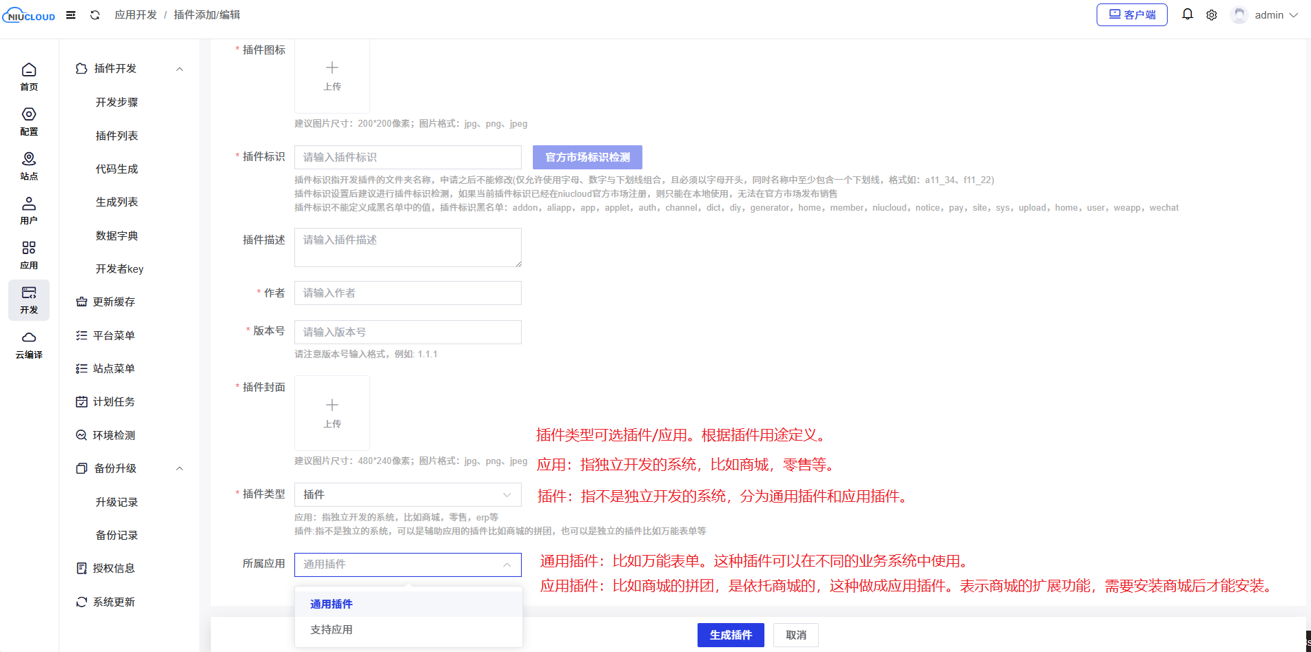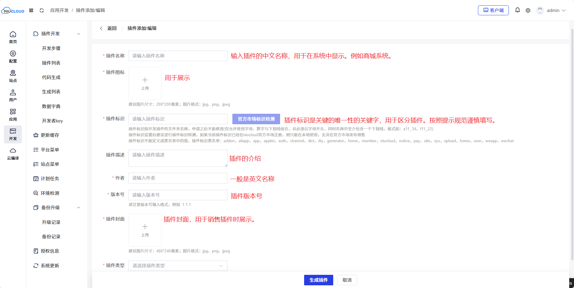 niucloud设计了新建插件的功能,通过新建插件,开发者可以快速创建自己的插件。系统根据开发者设置初始化基础的插件代码,方便开发者后续开发。