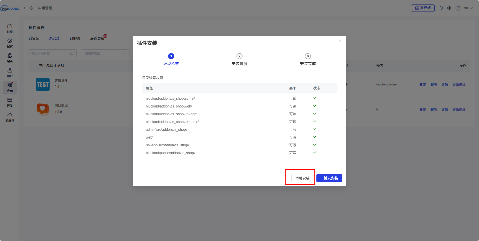 点击本地安装按钮,安装完成后,插件状态会切换为已安装。