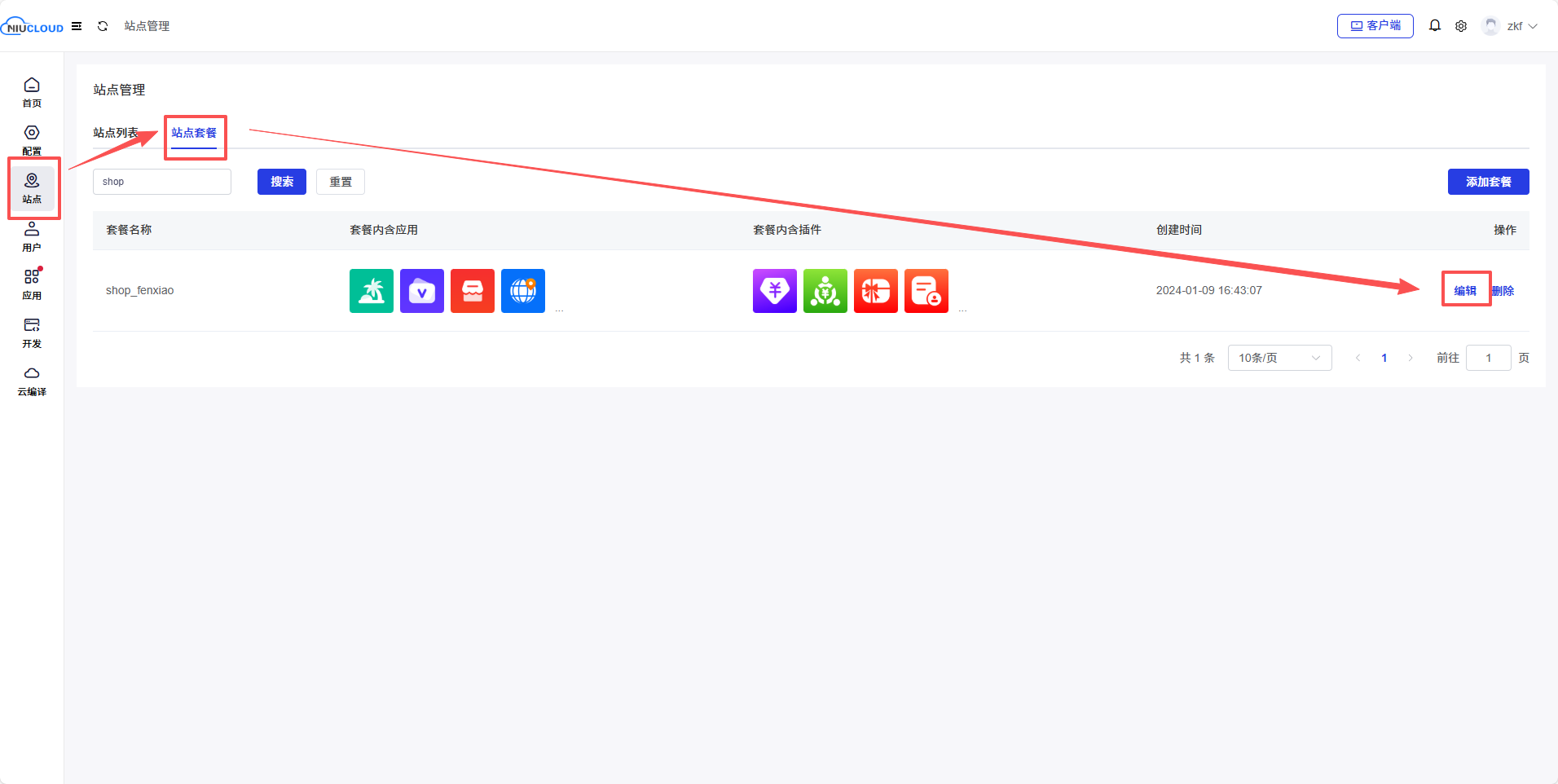 在站点套餐中,点击编辑按钮,在弹出的编辑窗口中,勾选需要添加的插件。