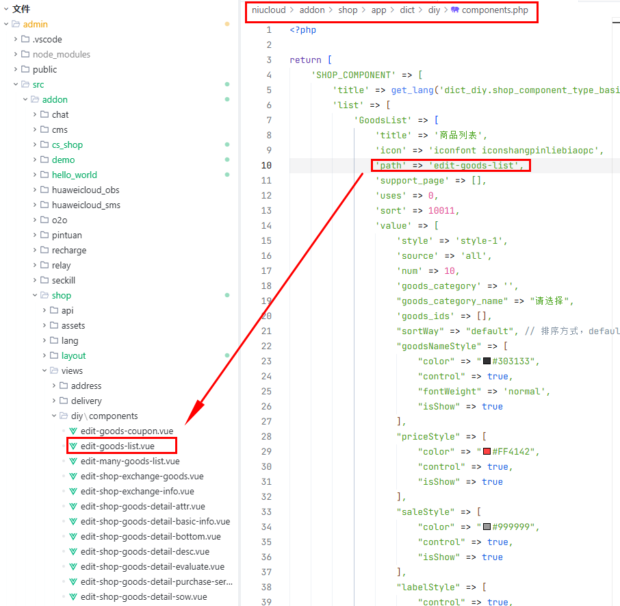 例如:path为edit-goods-list,编辑属性组件文件名称就是:edit-goods-list.vue
