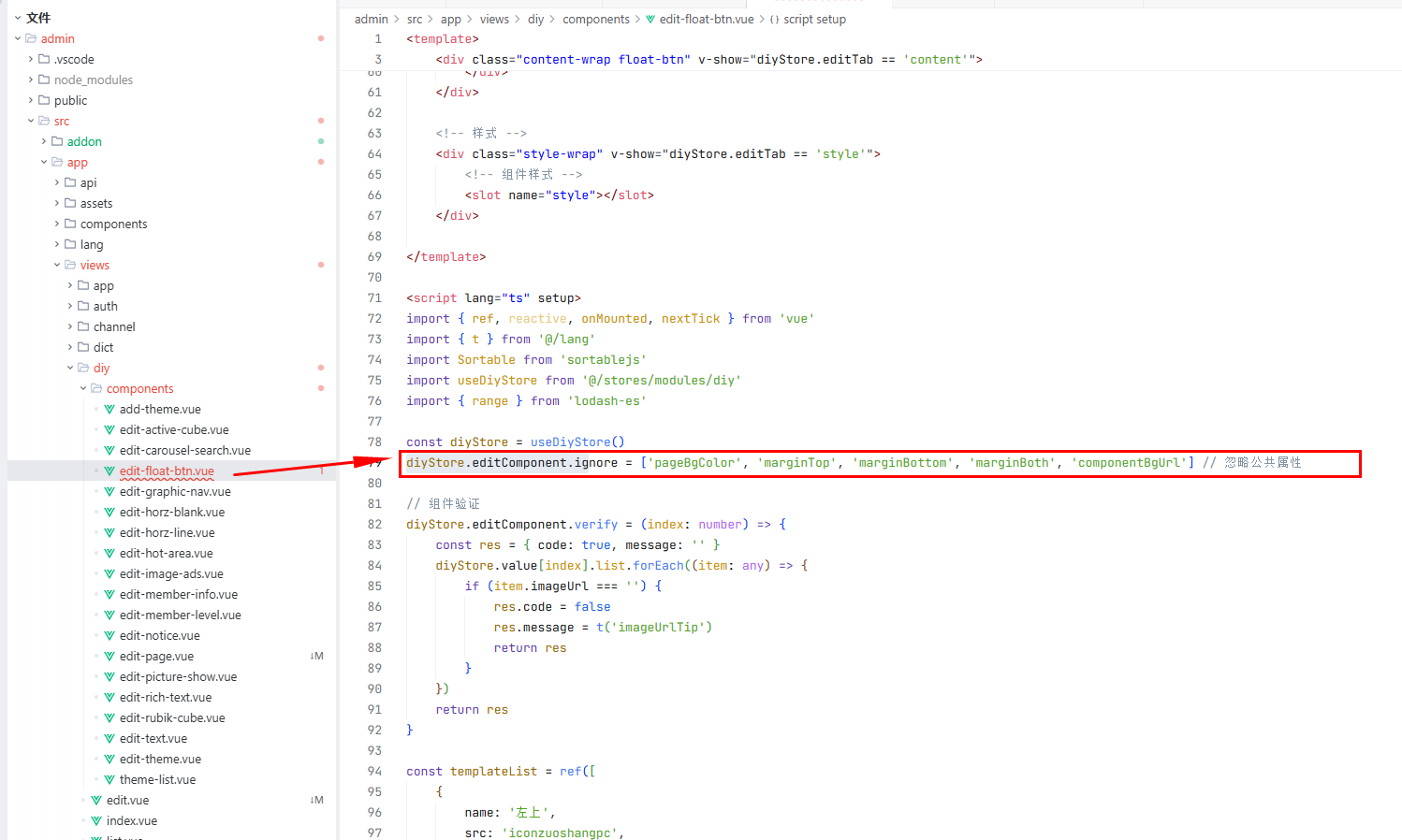 diyStore.editComponent.ignore = ['pageBgColor', 'marginTop', 'marginBottom', 'marginBoth', 'componentBgUrl'] // 忽略公共属性目前可忽略的属性如下: