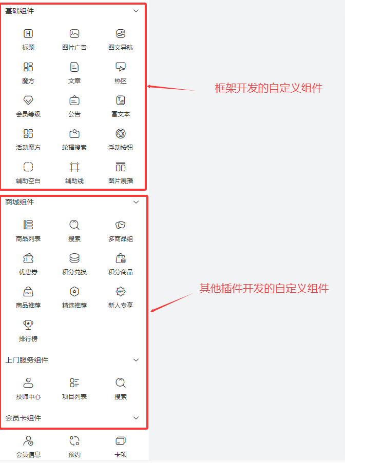 插件开发的自定义组件:第三方开发者通过插件机制开发的组件,如商城组件、会员卡组件等业务组件