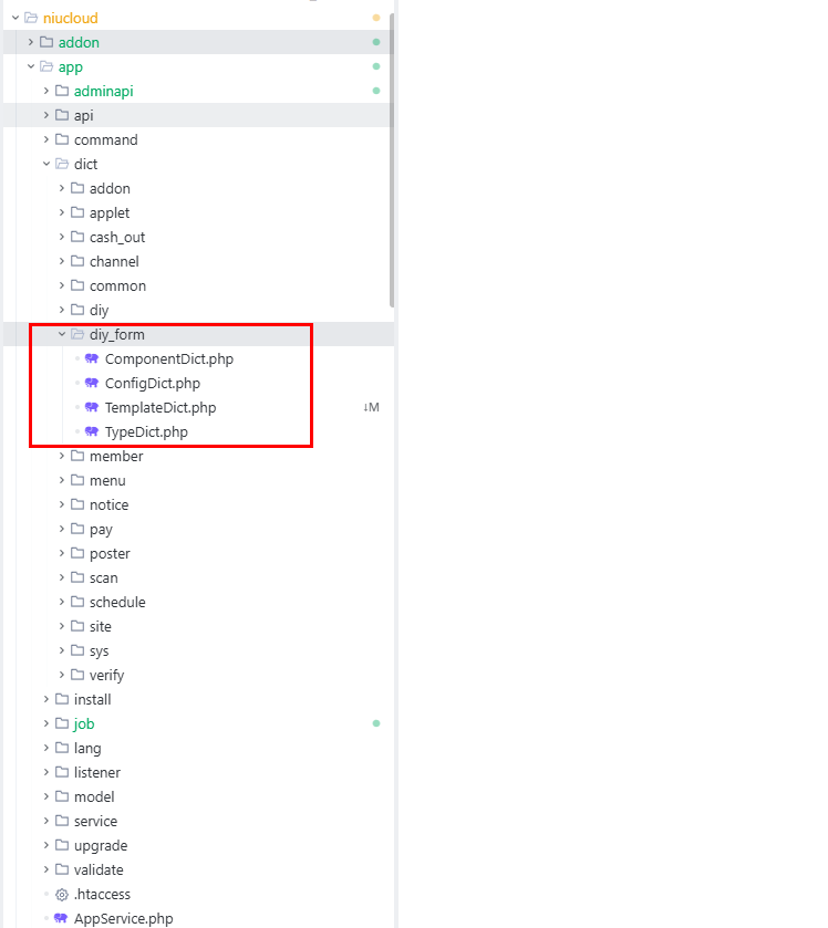 框架开发的的自定义功能代码位置:niucloud/app/dict/diy_form