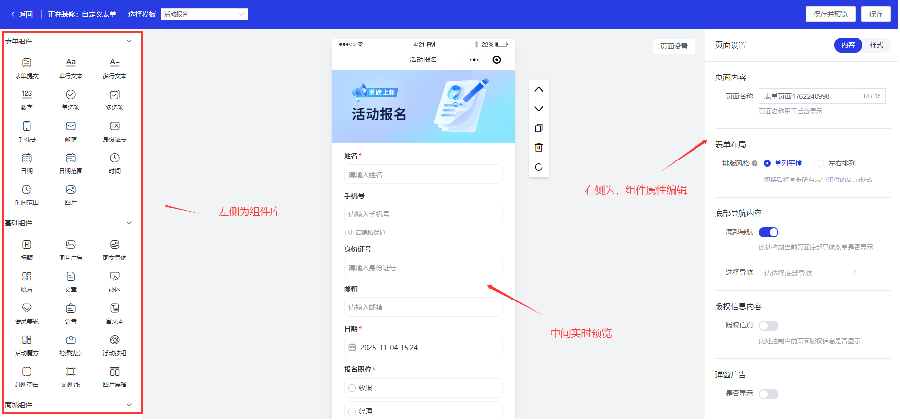 左侧展示组件库,中间实时预览,右侧可以编辑组件的属性设置等