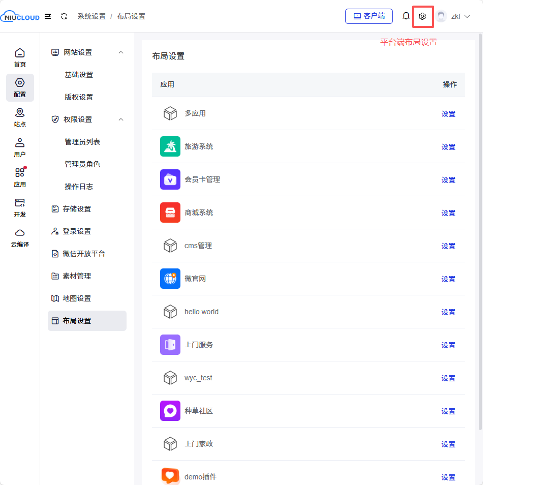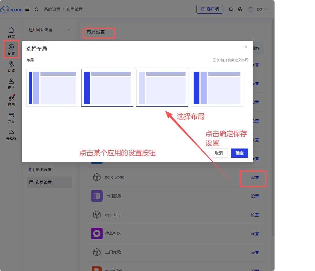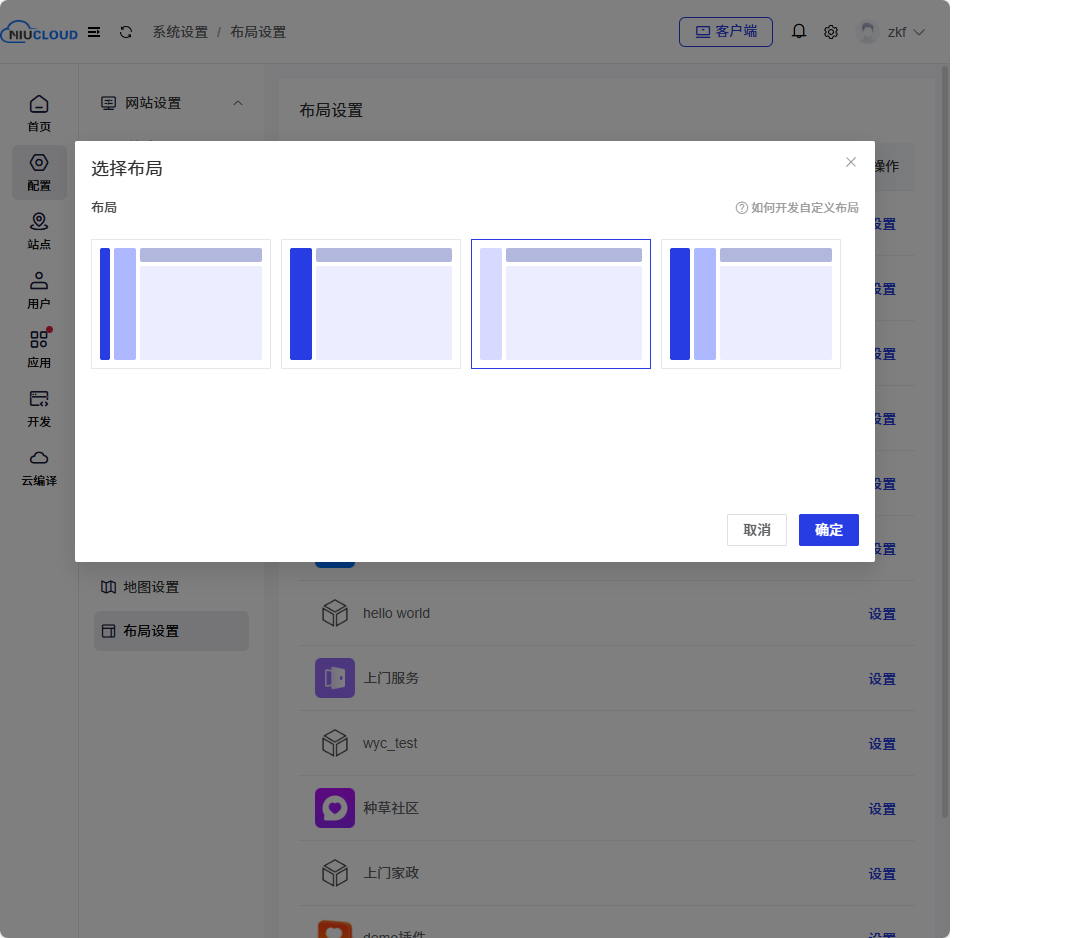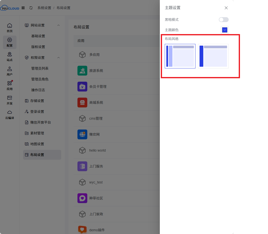 平台端可以给每个应用设置布局:在admin端打开配置--布局设置--点击应用后的设置,选择开发好的布局方式,点击确认,再次进入该单应用的站点布局就会修改成功。