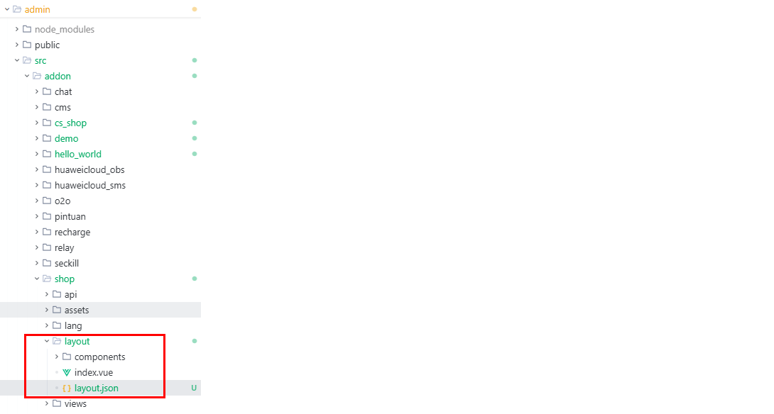 开发自定义布局,需在admin/src/addon/插件名称/layout/文件夹下创建index.vue、layout.json的文件。