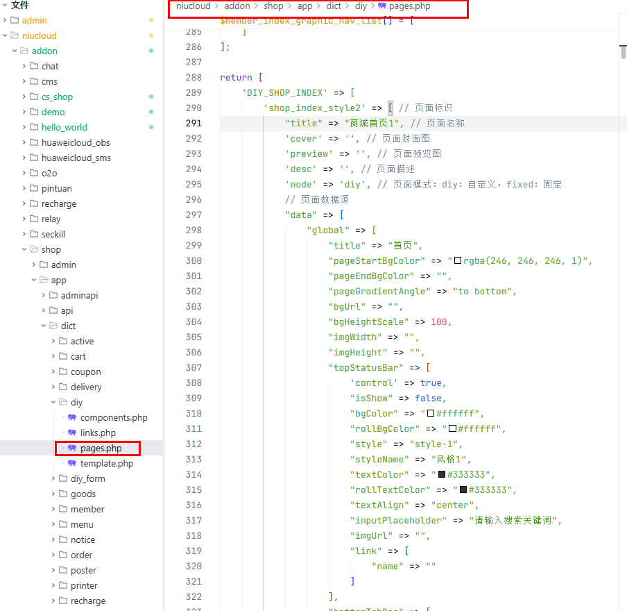 文件位置:niucloud/addon/shop/app/dict/diy/pages.php