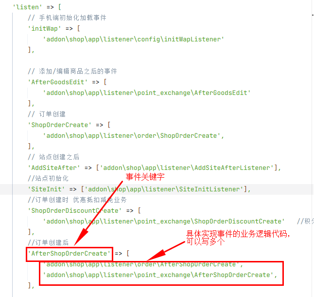 SiteInitListener:站点初始化事件监听AddSiteAfterListener:站点创建后事件监听MemberRegisterListener:会员注册事件监听