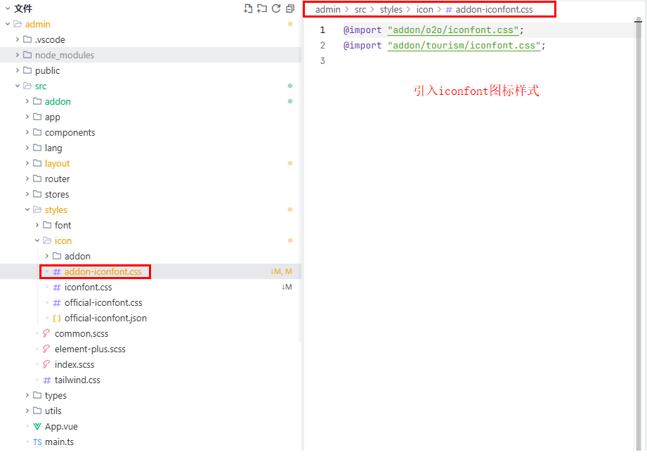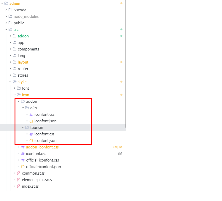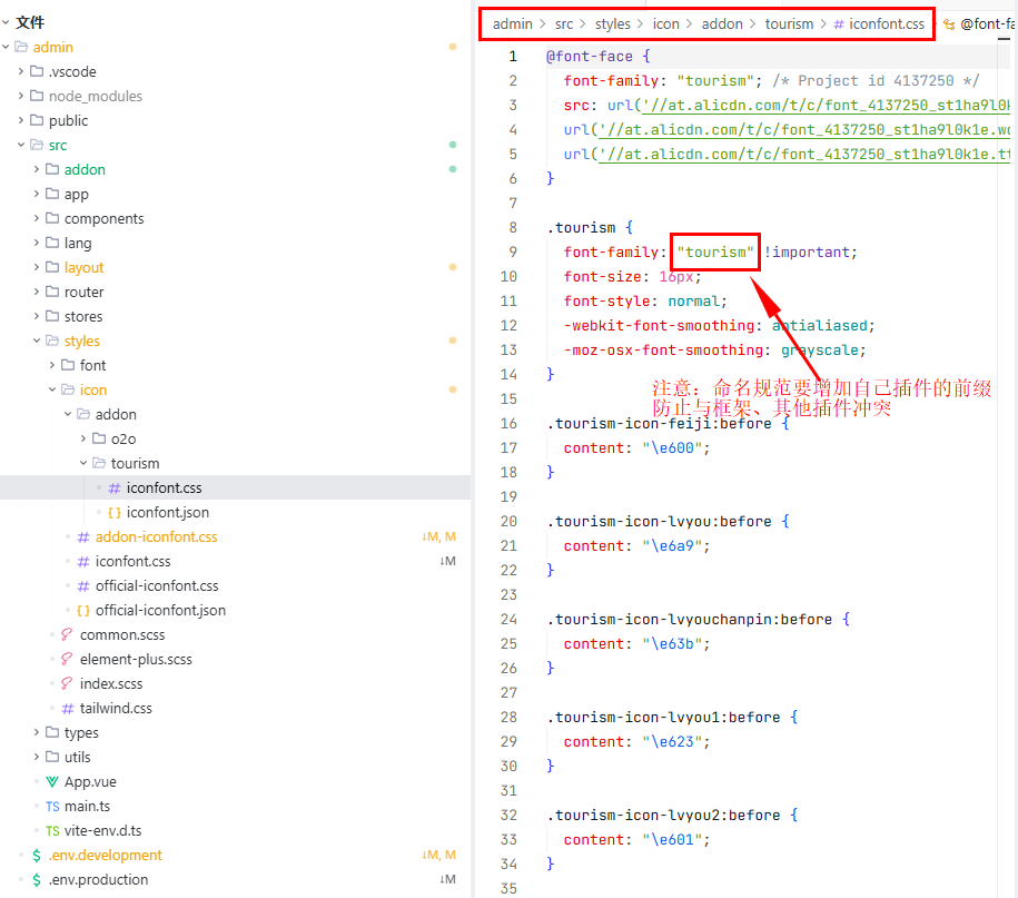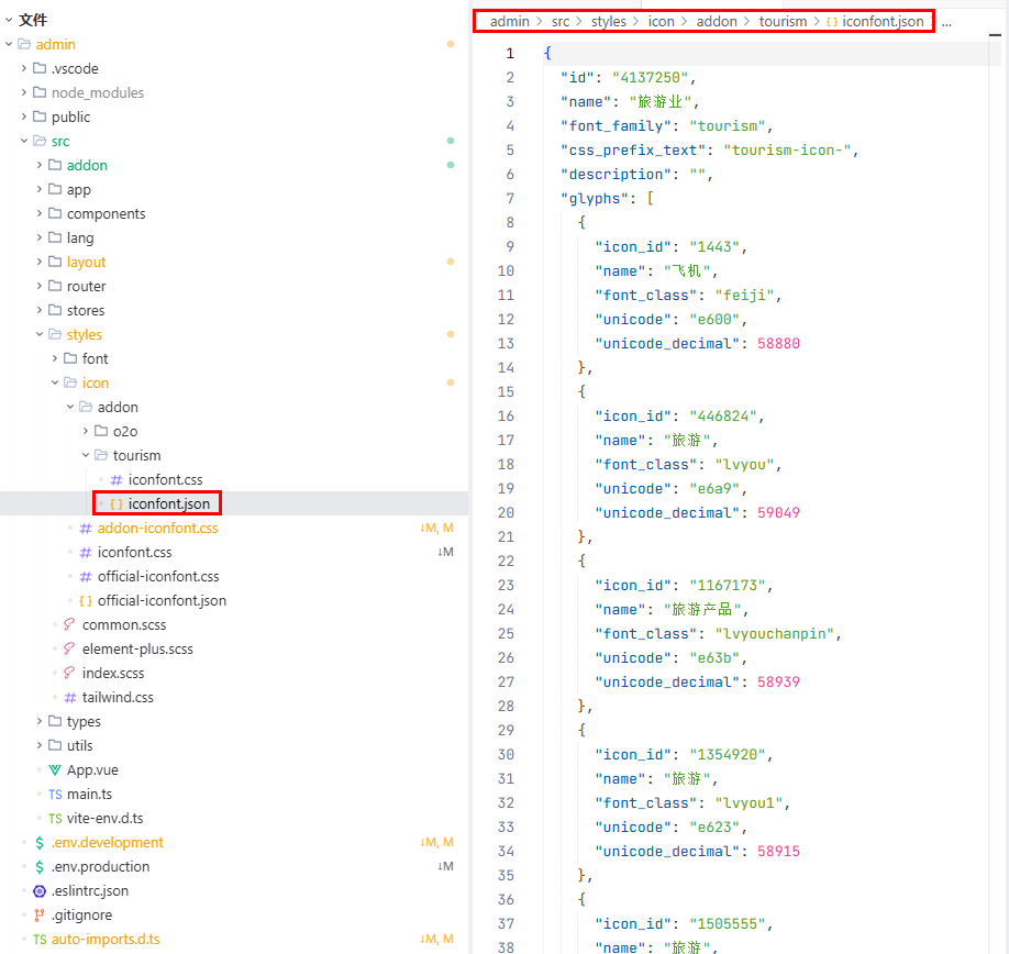 在 admin/src/styles/icon/addon 路径下新建插件名称的文件夹 引入iconfont图标样式 必须要有json文件,代码界面参考如下 iconfont 的字体 font-family 名称建议增加自己插件的前缀。防止与框架,其他插件命名冲突