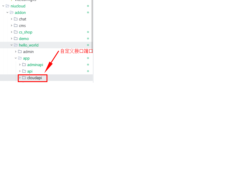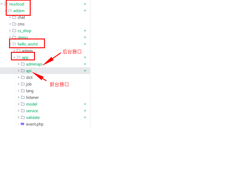 adminapi 后台接口层:用于后台管理系统调用,提供数据管理和业务操作功能。后台接口的文件存放路径为:niucloud/addon/hello_world/app/adminapi/