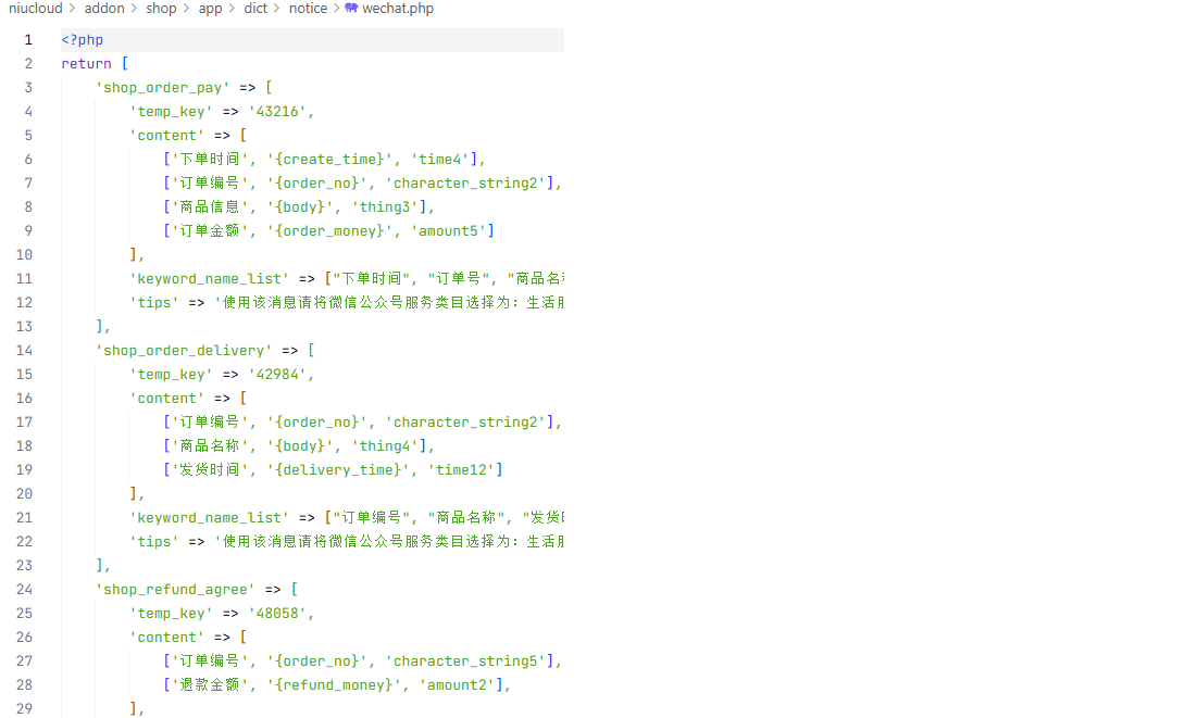 wechat.php 微信公众号消息模板内容