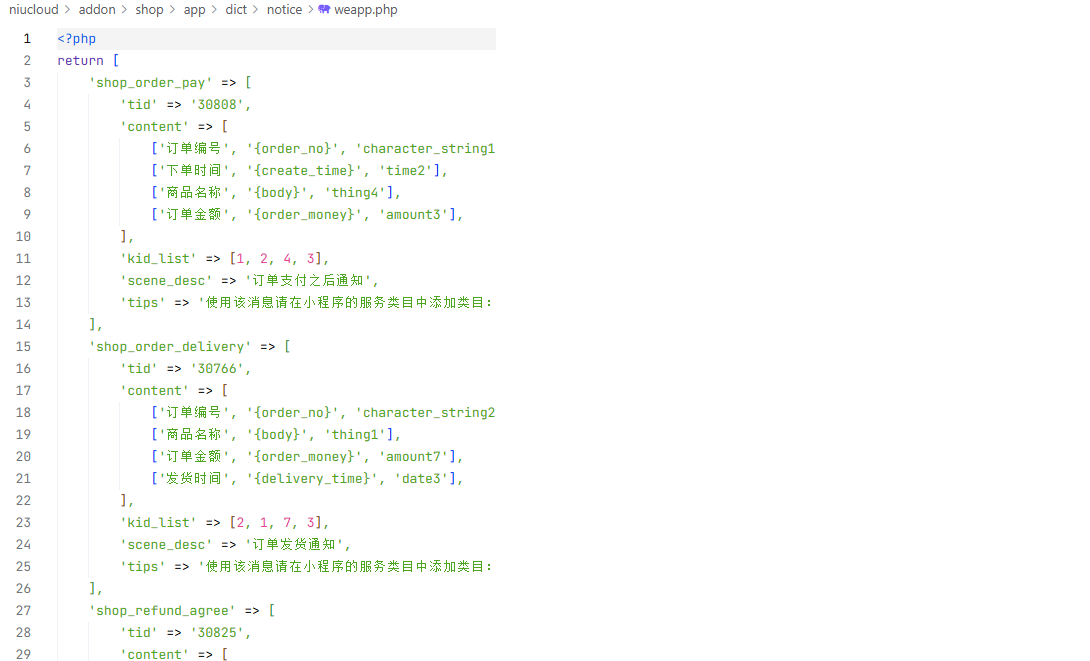 weapp.php 微信小程序消息模板内容