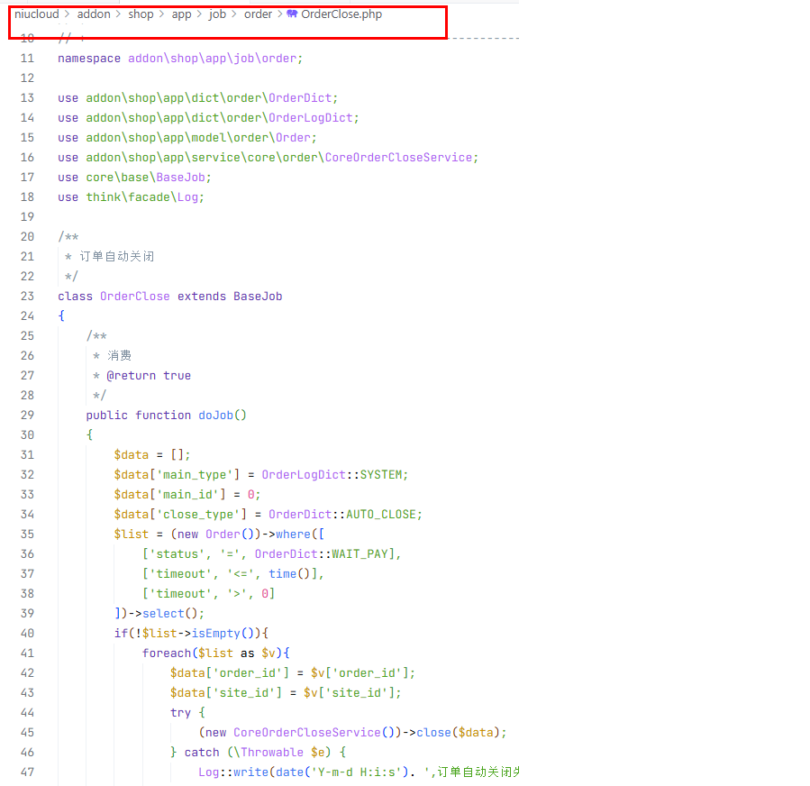 'class' => 'addon\shop\app\job\order\OrderClose', //任务消费层所在类的路径,类名为当前任务key值下划线转驼峰的类。例如当前任务key值为shop_order_close,任务消费类的位置就为niucloud\addon\shop\app\job\order\OrderClose.php,类名为OrderClose