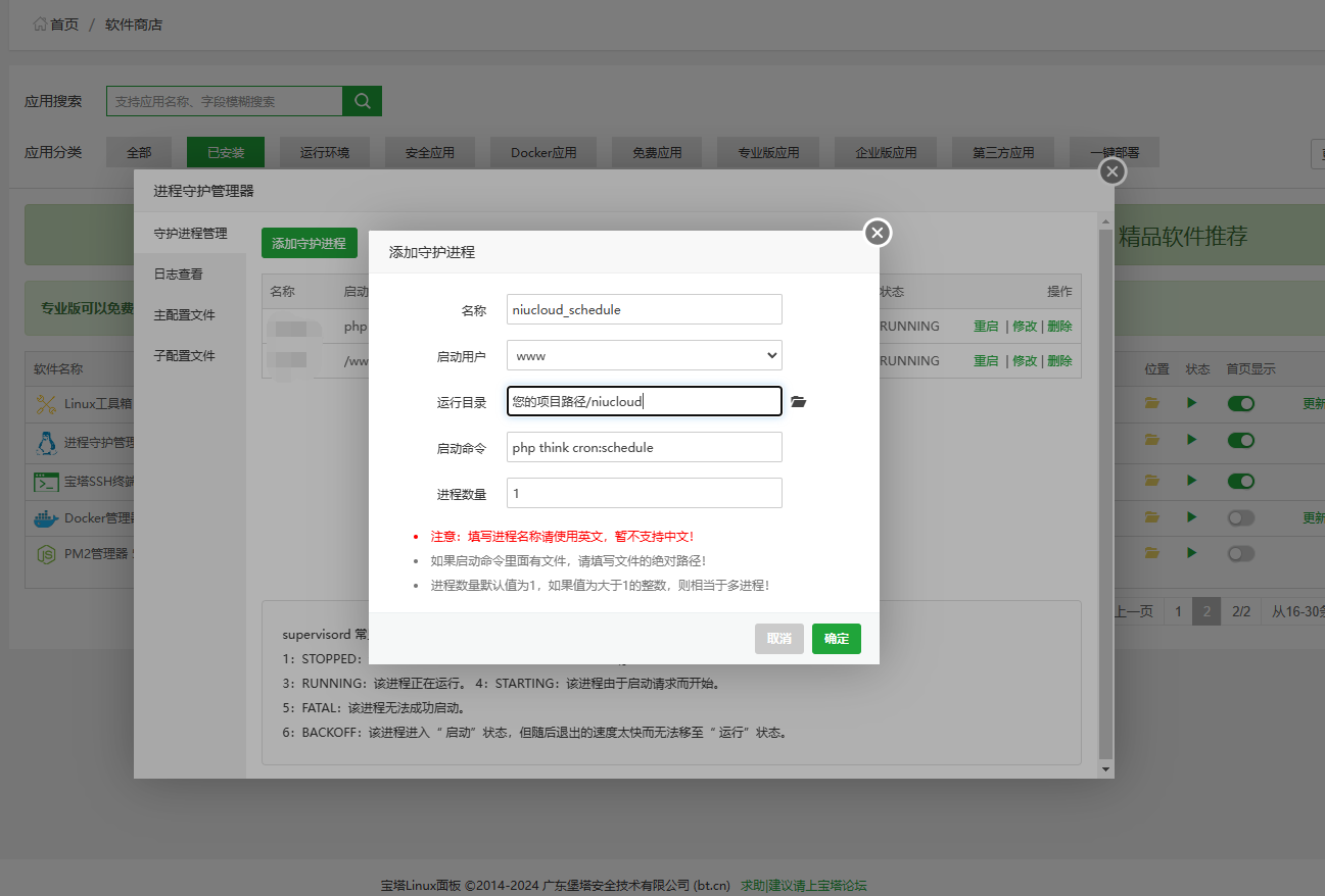 登录宝塔面板->进入「软件商店」->安装「Supervisor管理器」->点击「添加守护进程」->填写进程名称、执行目录和启动命令->启动命令填写:php think cron:schedule->保存并启动