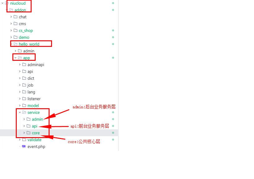 hello_world 插件的 service 层目录结构遵循 niucloud 框架规范: