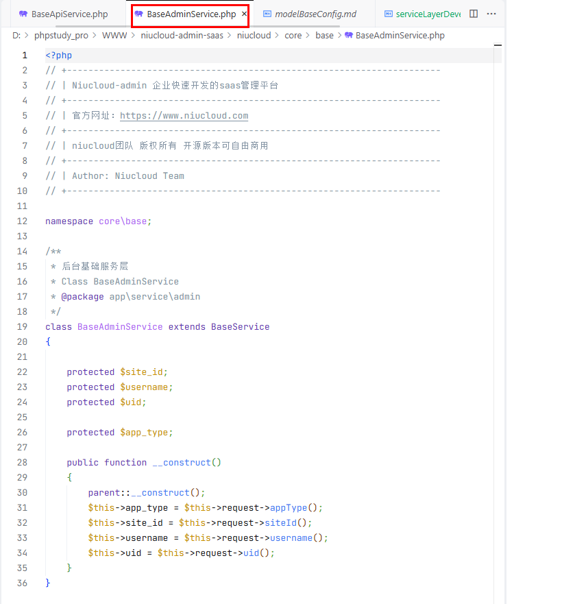 后台服务层:继承 BaseAdminService,里面定义了后台服务层的核心功能。