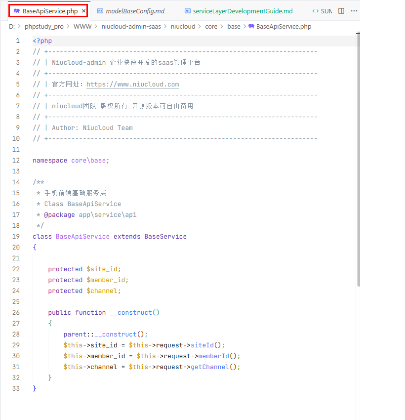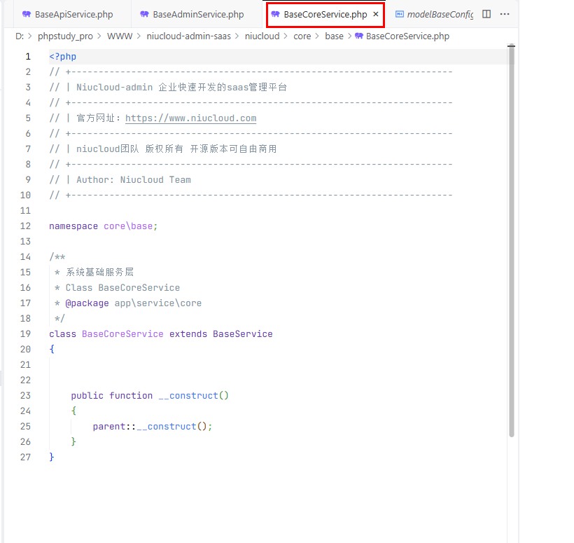 公共核心服务层:继承 BaseCoreService,里面定义了公共核心服务层的核心功能。admin(后台)、api(前台)都可以调用,这样可以防止代码冗余,编写重复代码,方便后期维护。