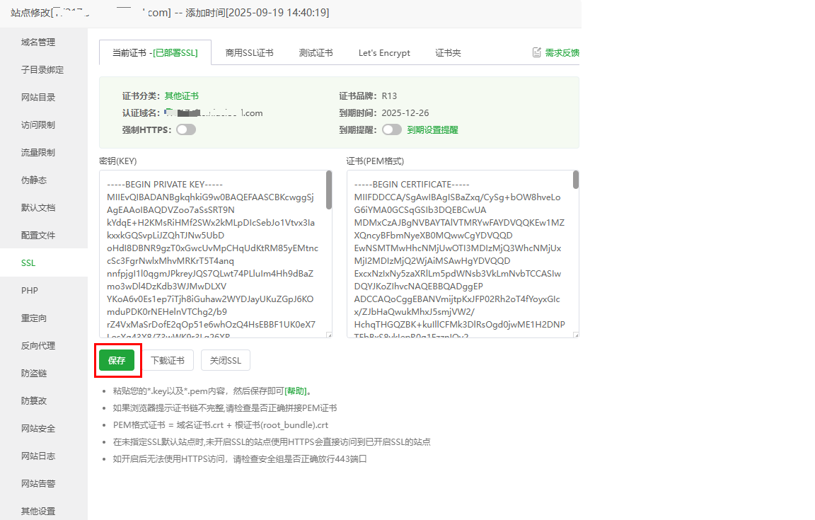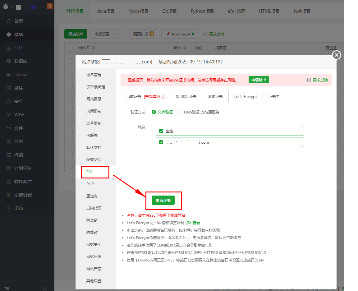 宝塔面板集成了Let's Encrypt免费证书申请功能,操作简便: