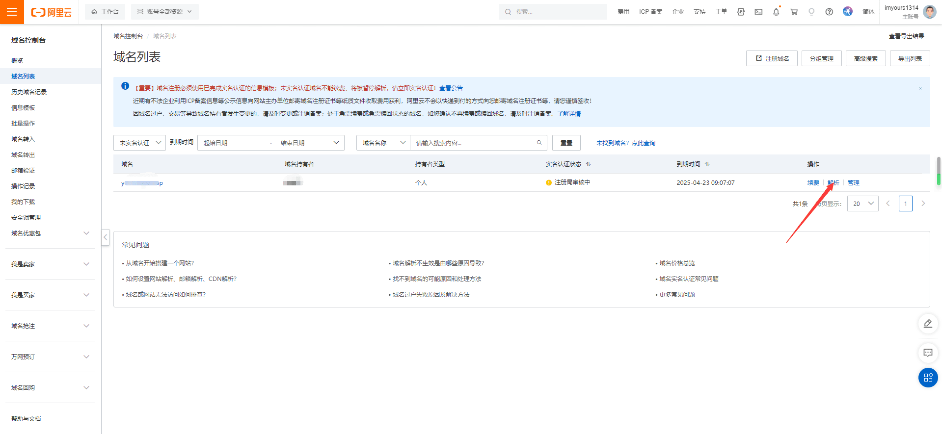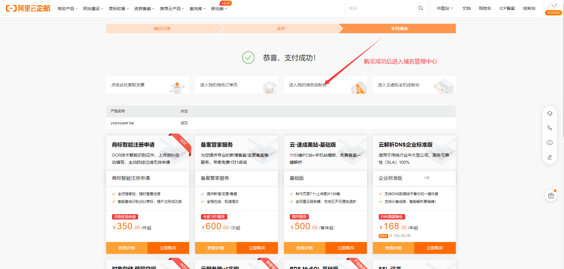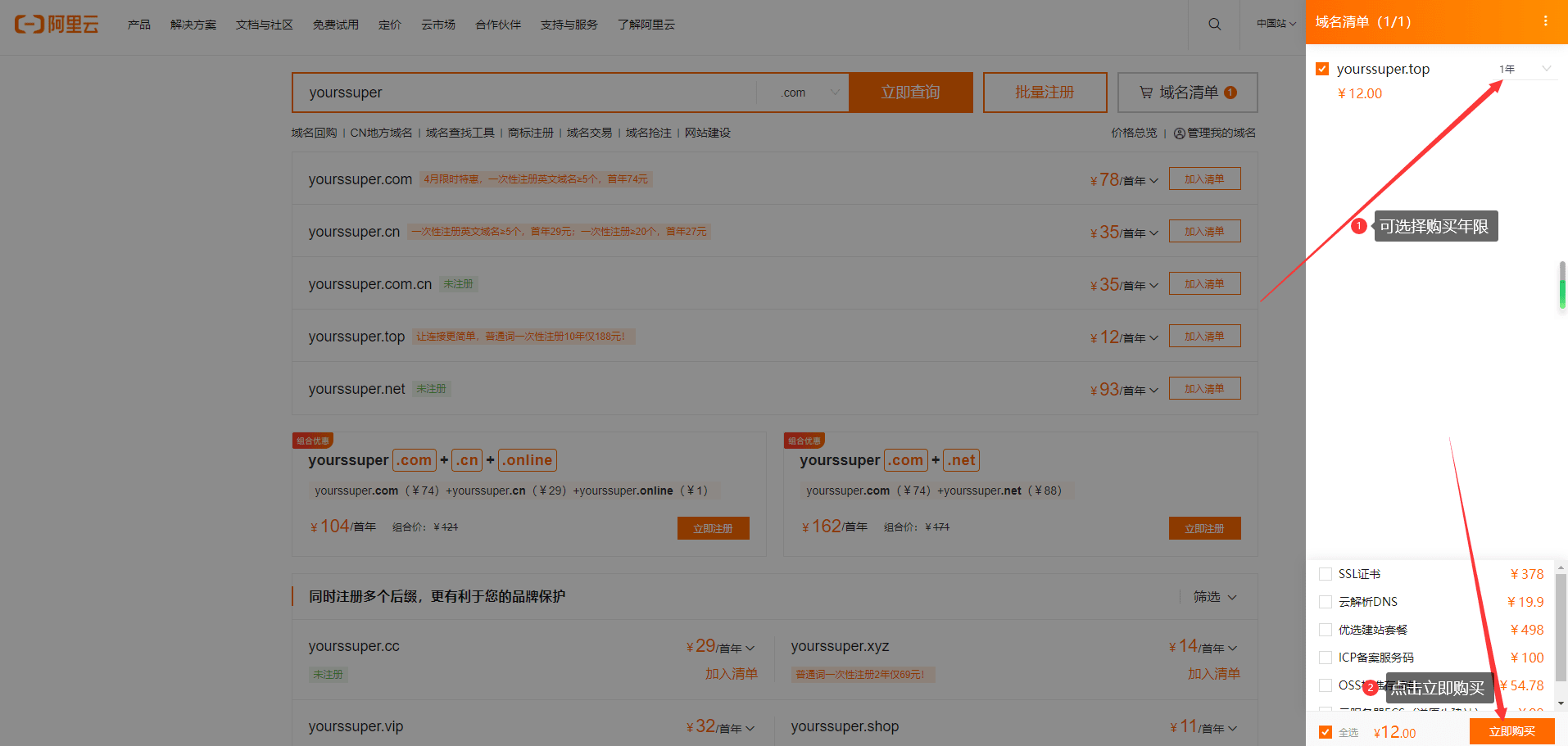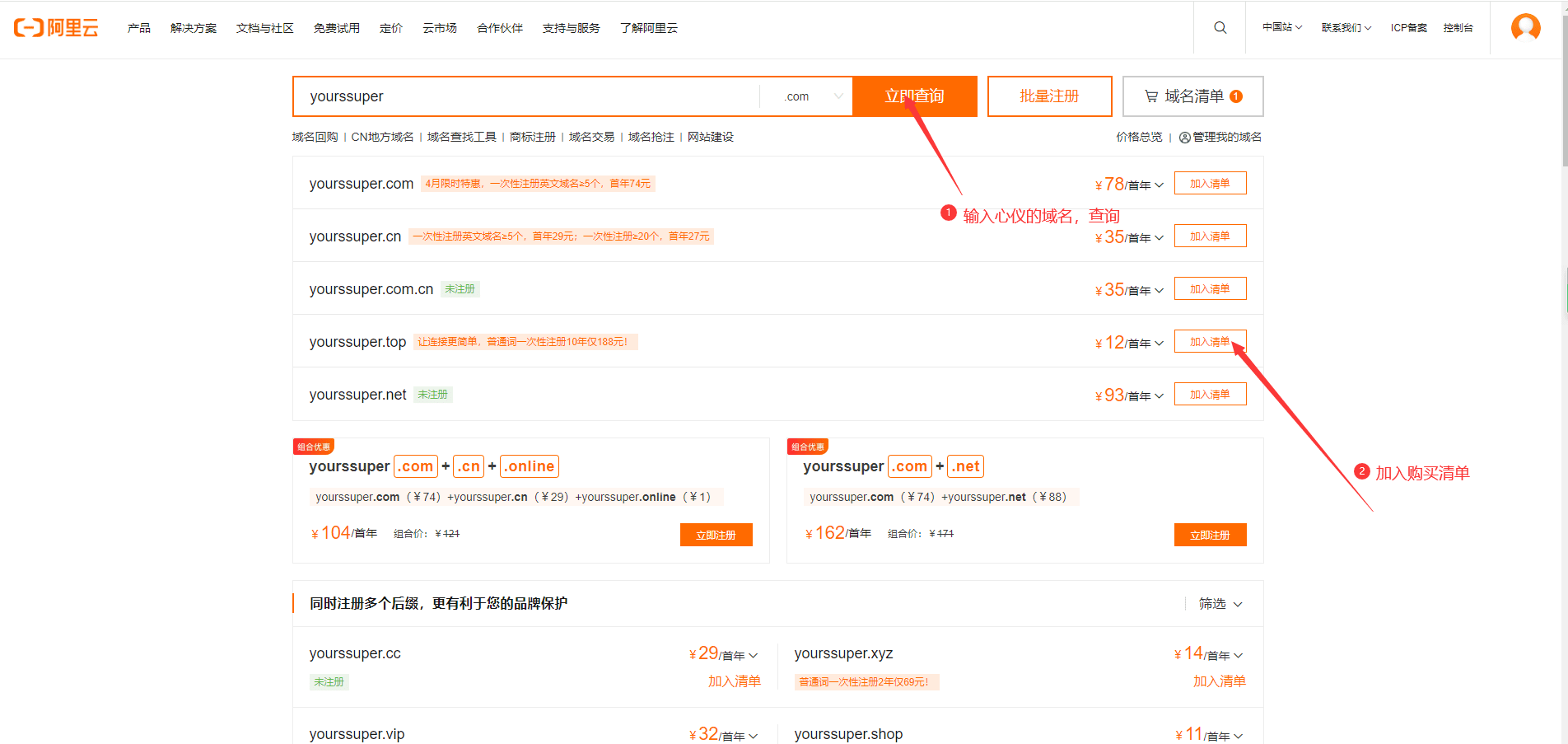 输入心仪的域名单击查询,后将查询出的域名加入到购买清单中
