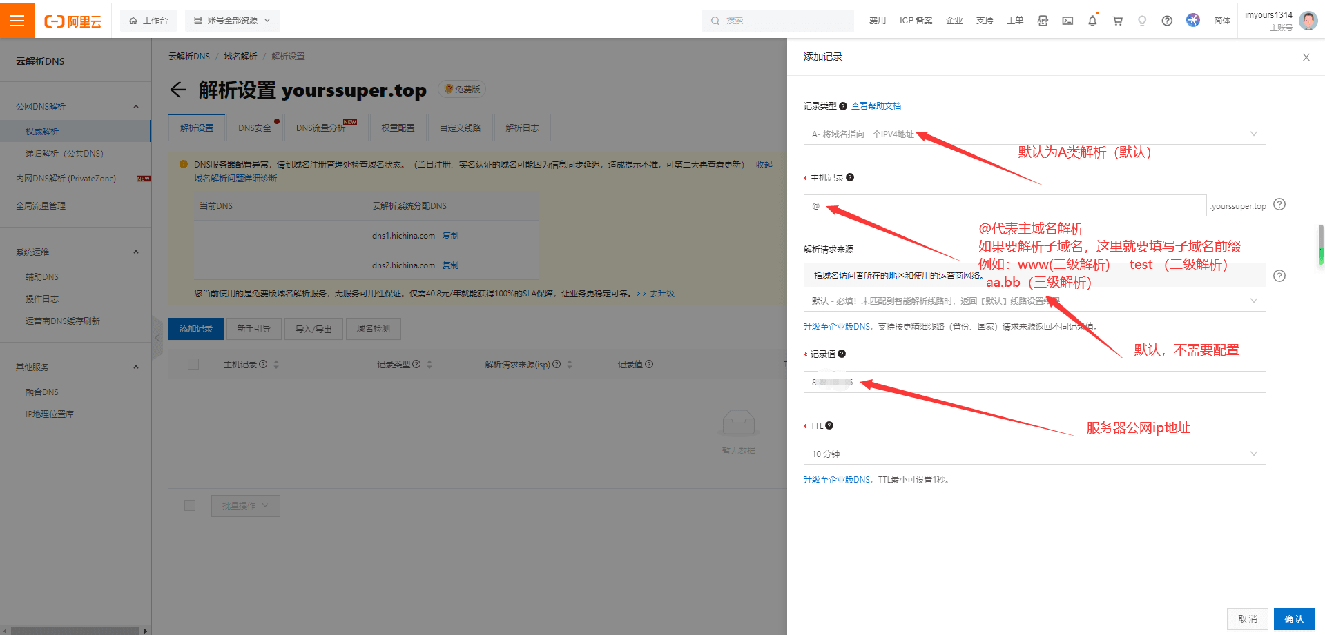 主机记录:@代表主域名解析如果要解析子域名,这里就要填写子域名前缀例如:www(二级解析)test(二级解析)aa.bb(三级解析)
