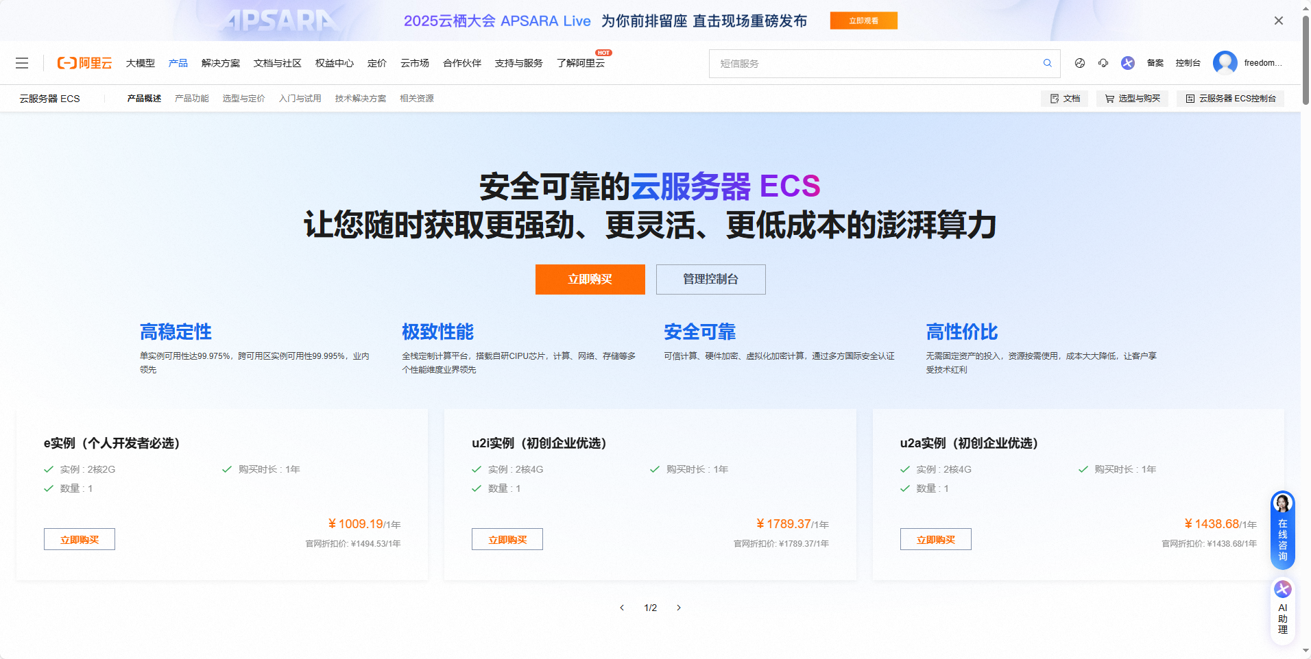 二、在顶部导航栏中选择 产品 → 精选产品 → 云服务器ECS