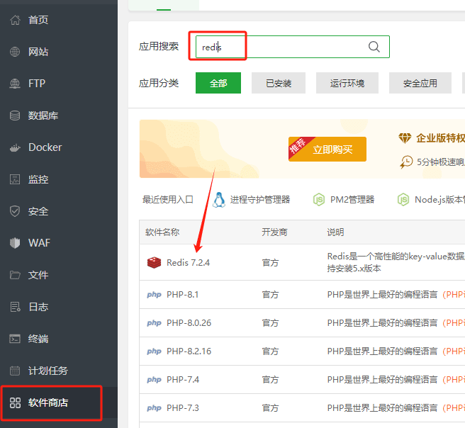 如果未安装可在宝塔侧边栏软件商店,搜索下载即可