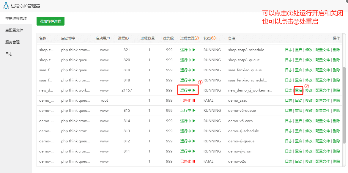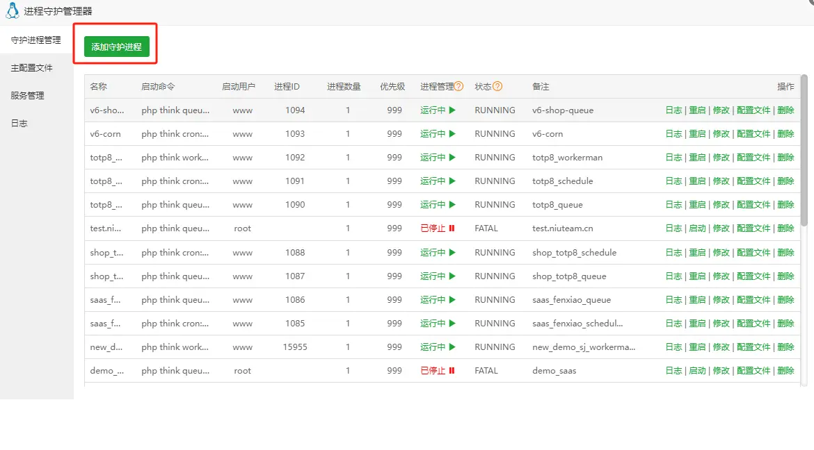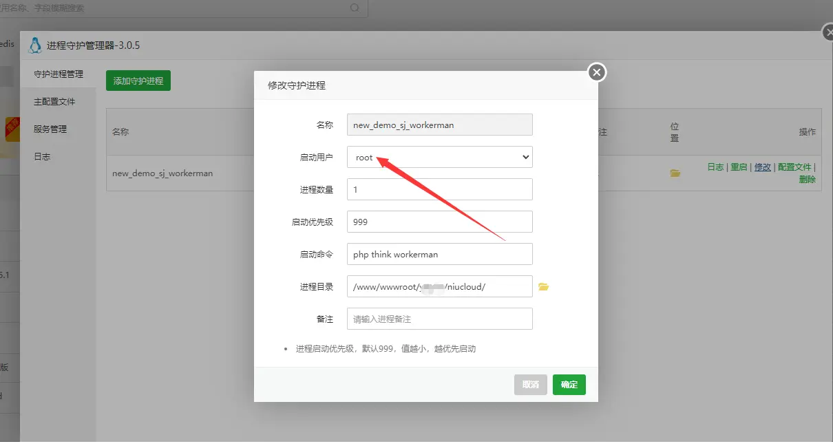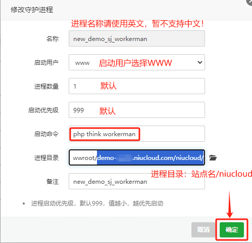 2.2 进程名称请使用英文,暂不支持中文!启动用户选择WWW,运行目录选择程序的根目录下的niucloud(站点名/niucloud),输入下方命令,保存即可。
