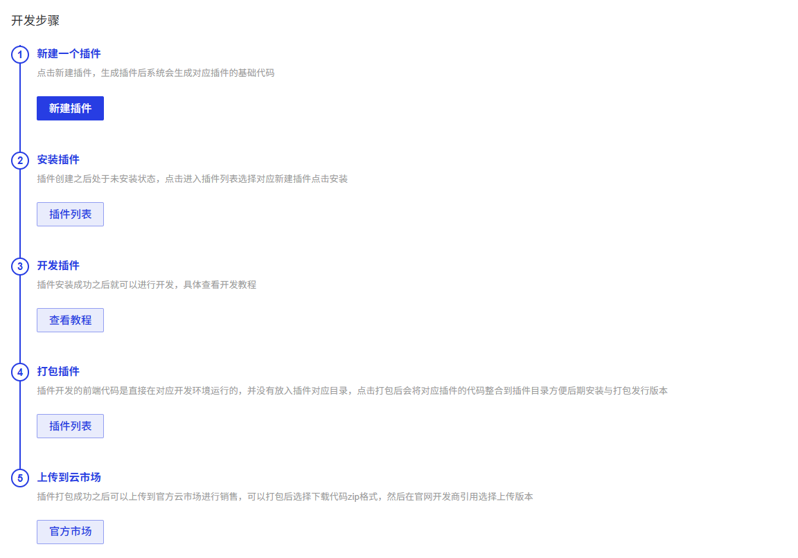 开发步骤详细介绍了在系统中进行插件开发的完整流程,从创建插件到发布上线的具体操作步骤。