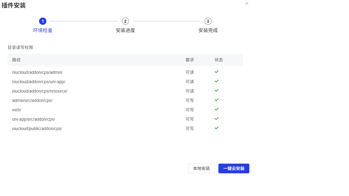 一键云安装:实现一键安装,不仅会把应用和插件的程序代码安装处理,同时会在云端编译各前端代码。云安装完成之后即可正常使用程序!