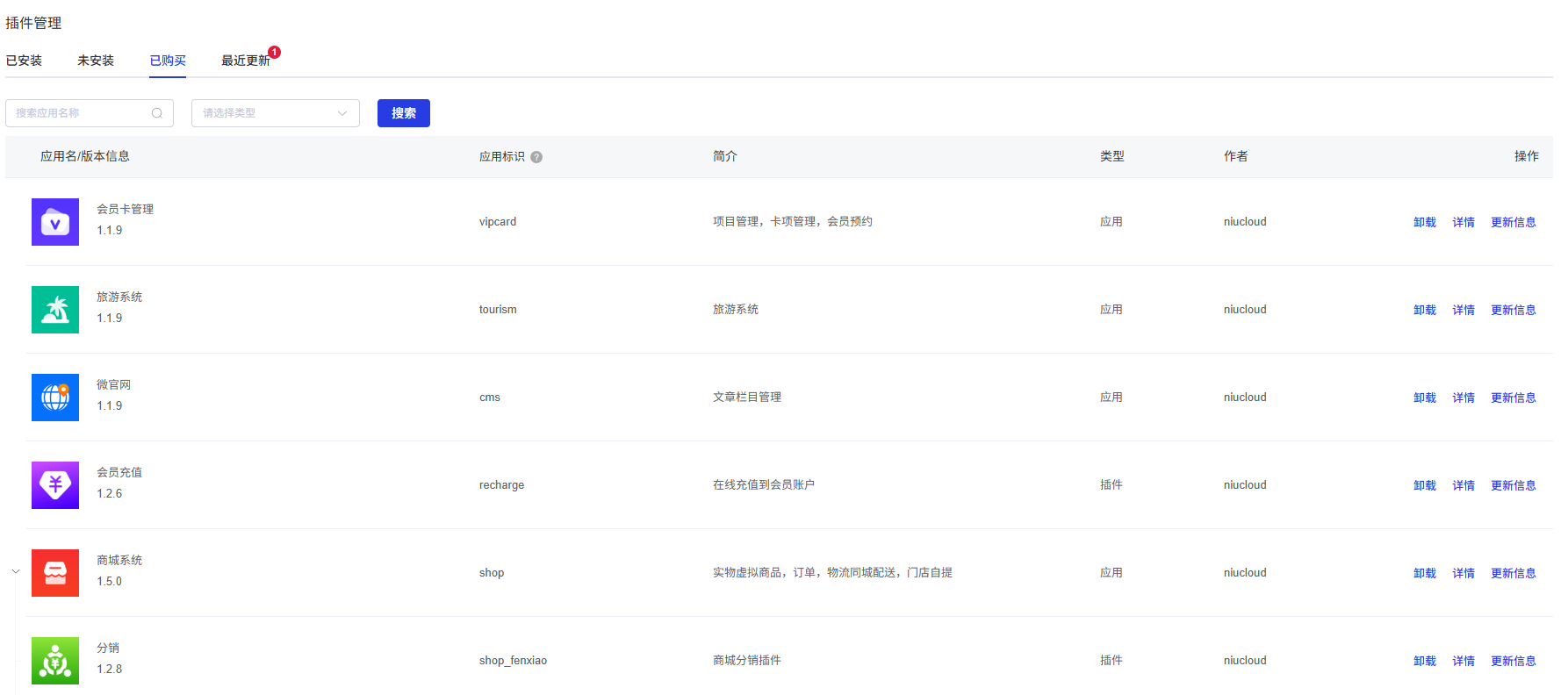 详情:点击插件详情按钮,可查看插件的详细信息,包括插件名称、简介、作者、版本等。