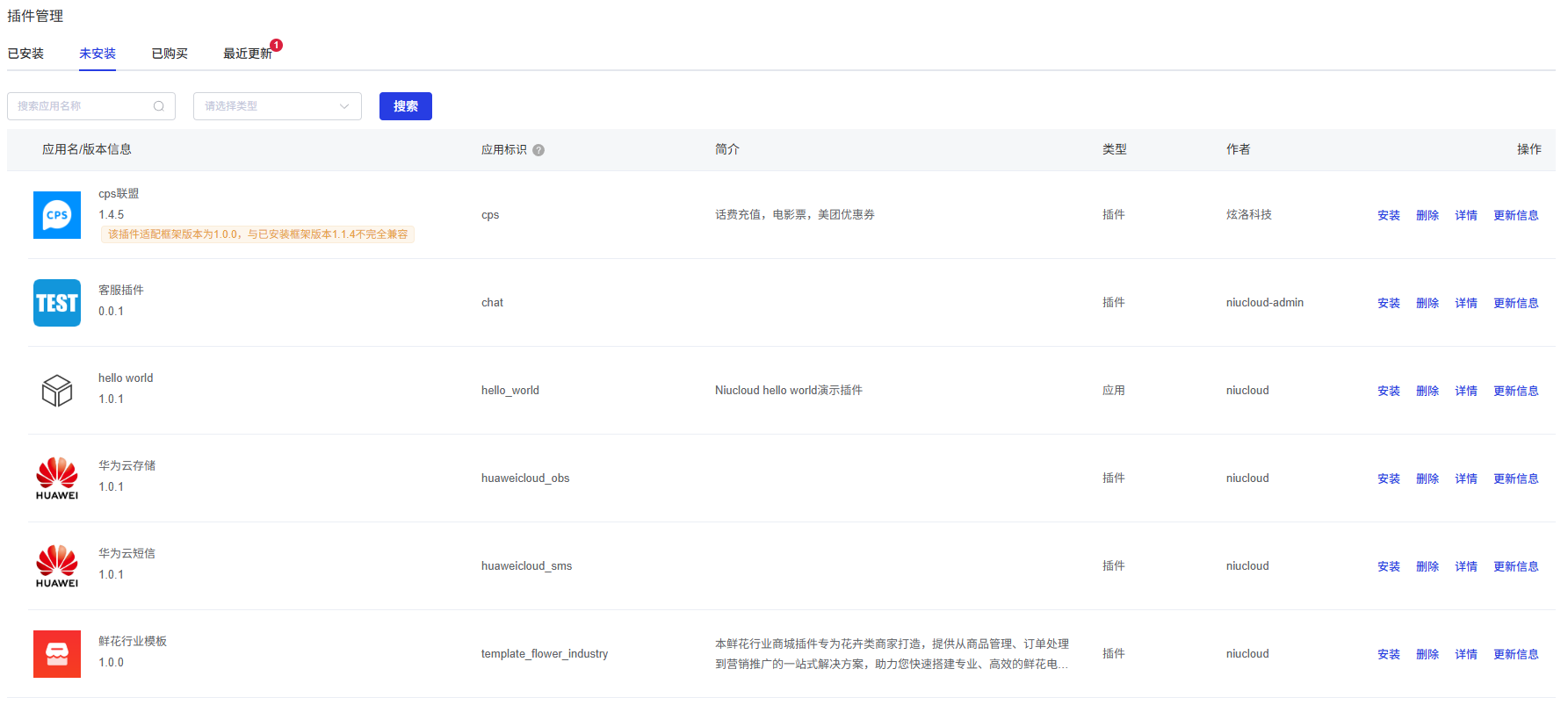 未安装标签页用于显示所有可供安装的插件列表。