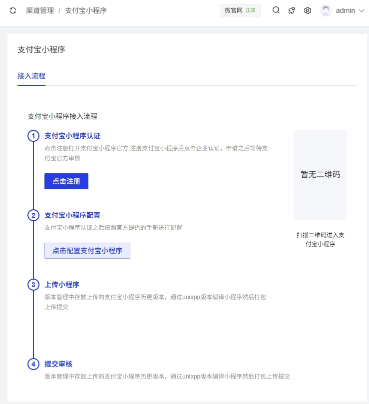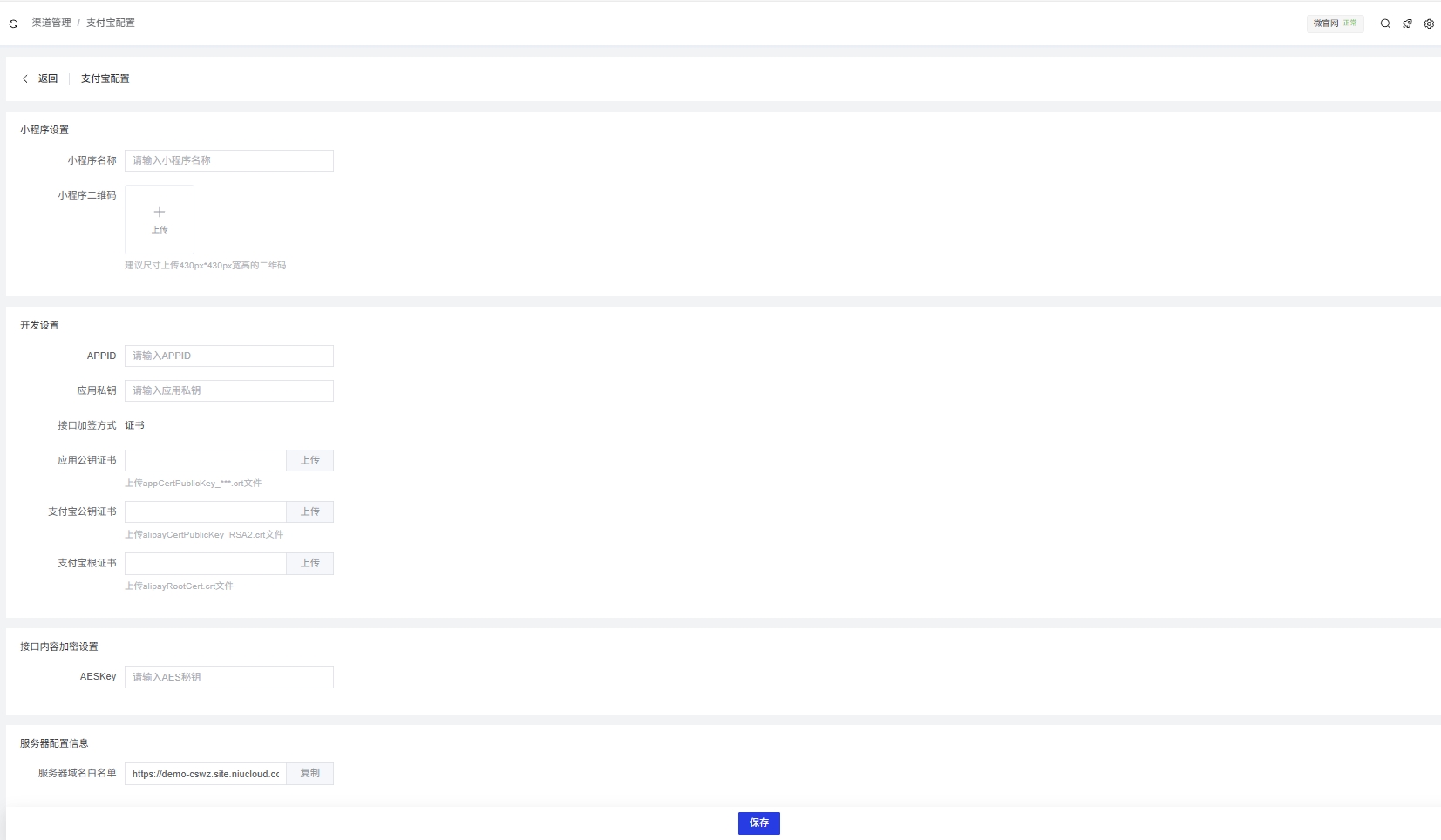 支付宝小程序模块用于管理系统与支付宝小程序的对接与配置,支持小程序认证、小程序信息配置、证书上传等功能,帮助用户实现支付宝小程序的快速接入和配置。