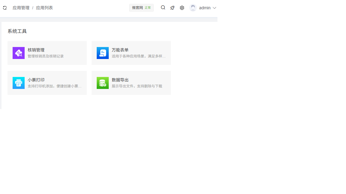 应用列表展示平台所有可用的系统工具和应用模块,方便用户快速访问和管理各项功能。