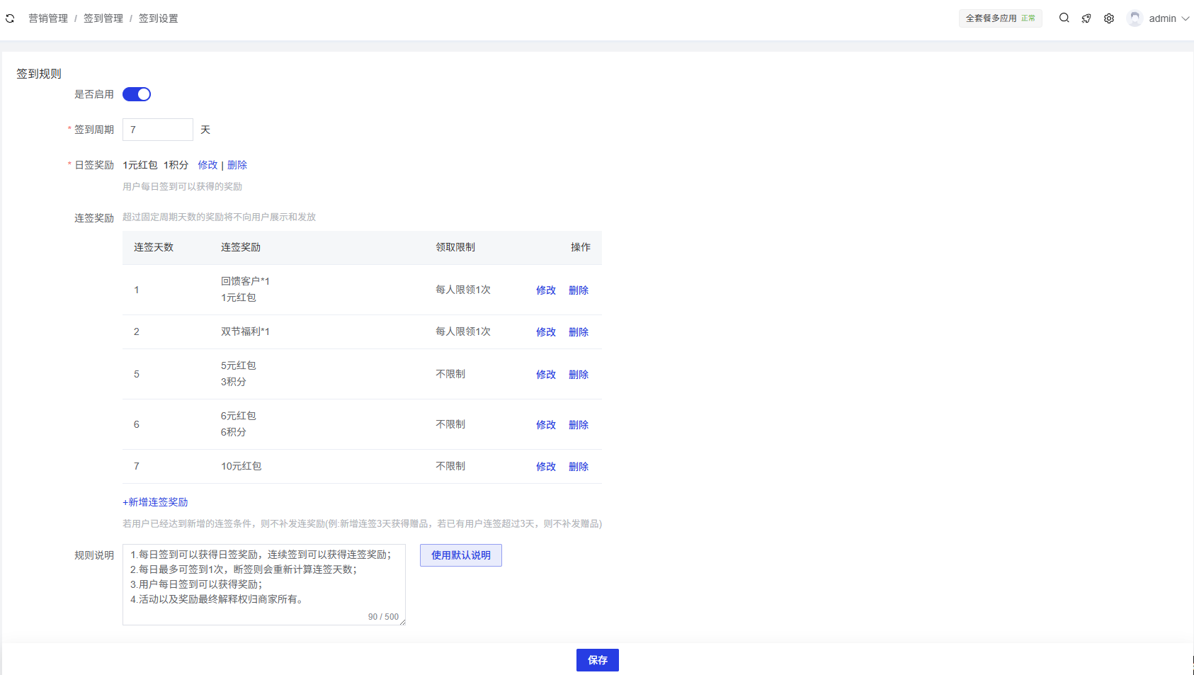 签到设置页面用于配置会员签到的具体规则,帮助灵活开展会员签到活动,提高会员活跃度和留存率。