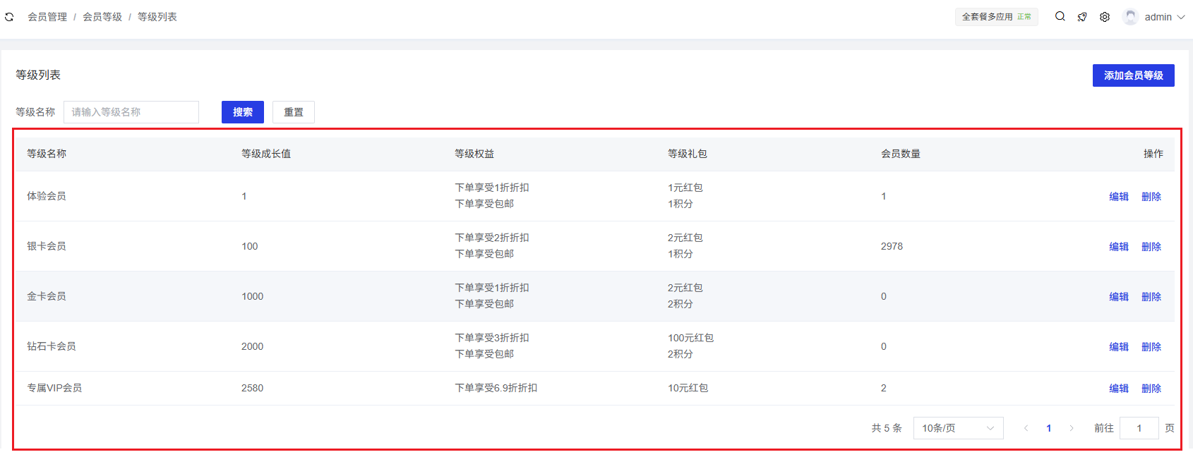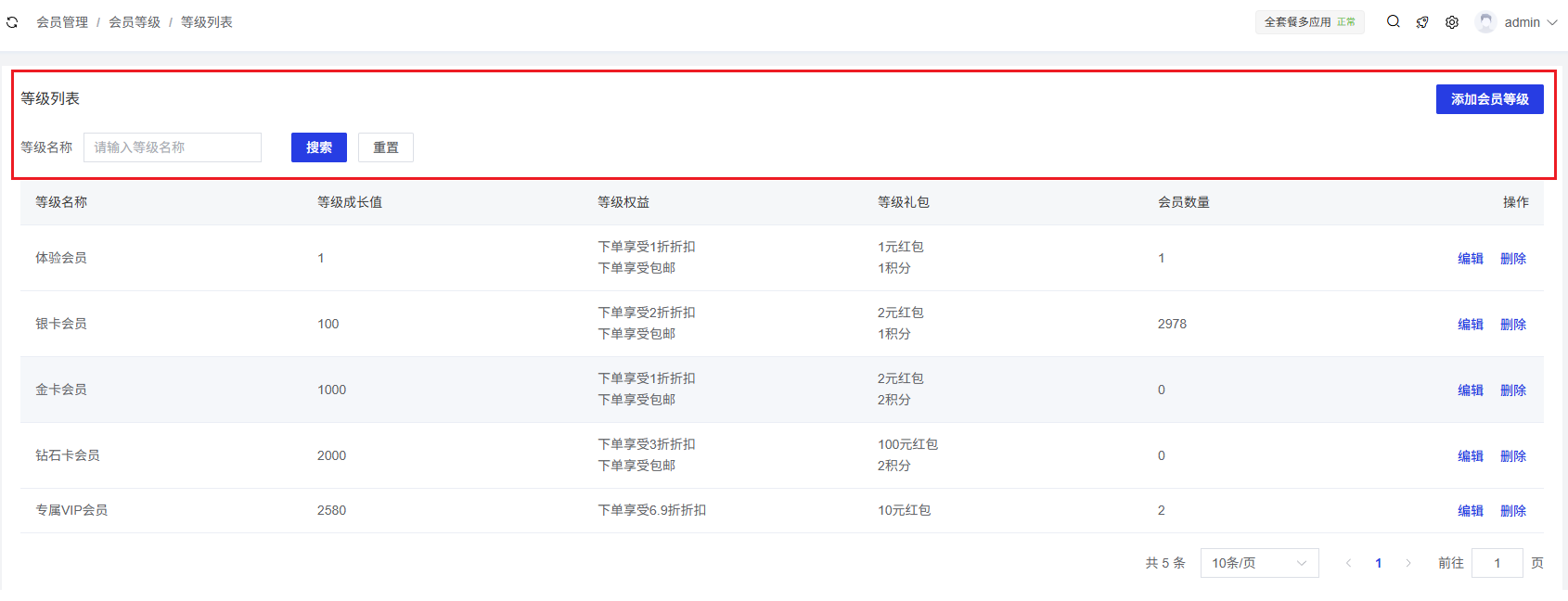 会员数量:展示当前属于该等级的会员数量。