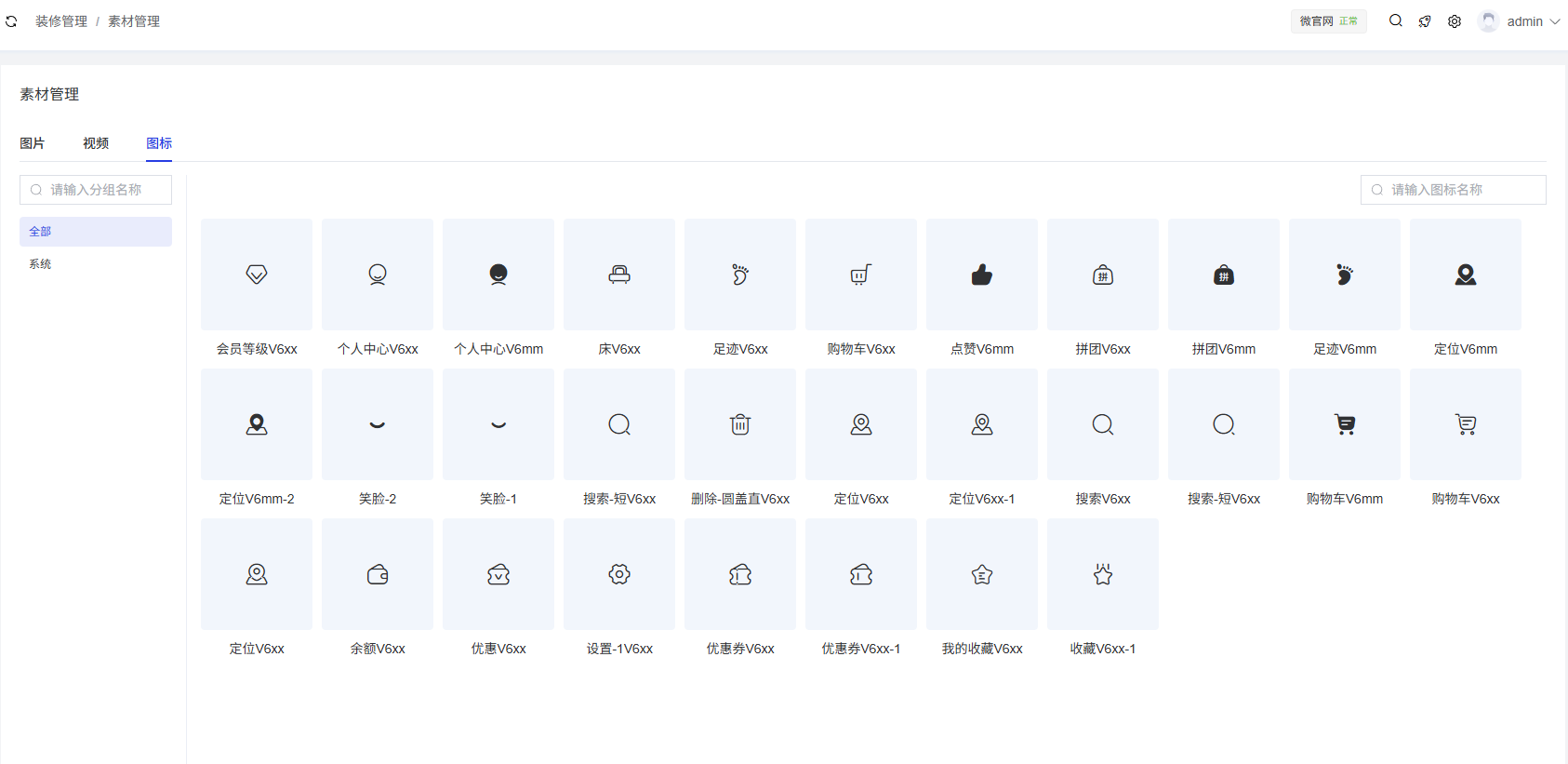 搜索功能:根据分组名称和图标名称进行搜索。