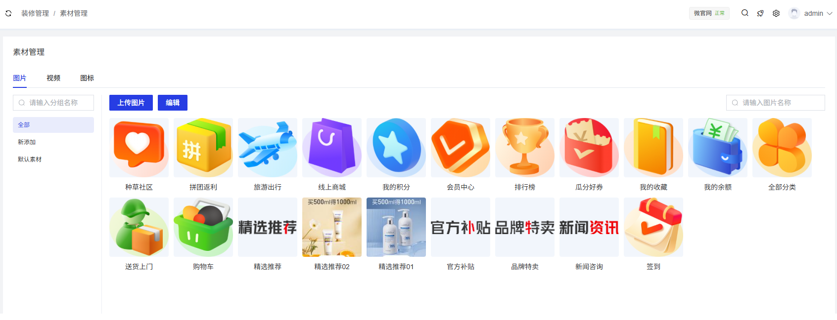 素材管理模块用于集中管理系统中使用的各类媒体资源,包括图片、视频和图标。