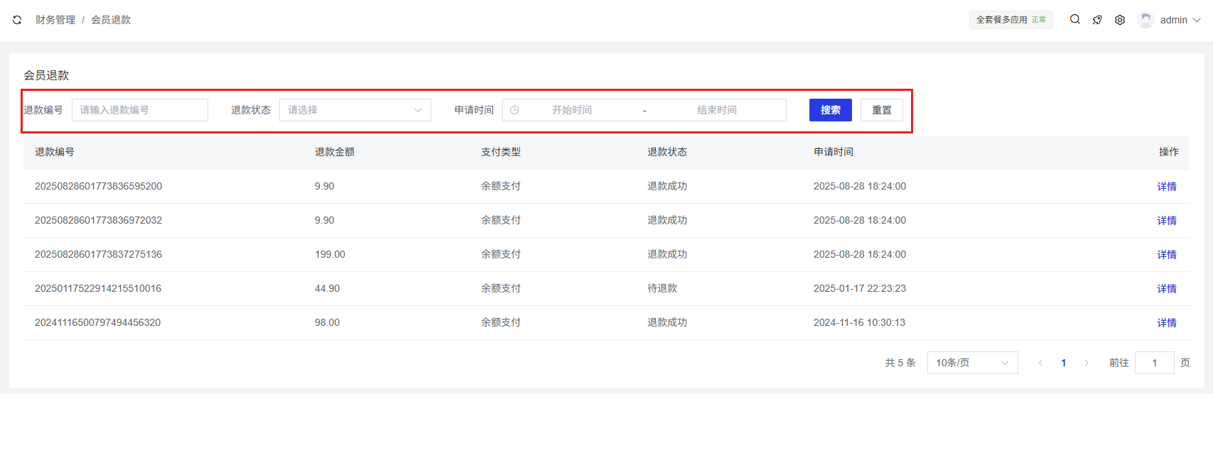 提供多种筛选条件,方便用户快速定位特定的退款记录: