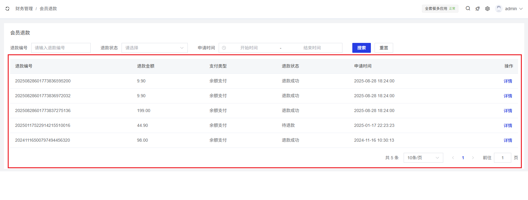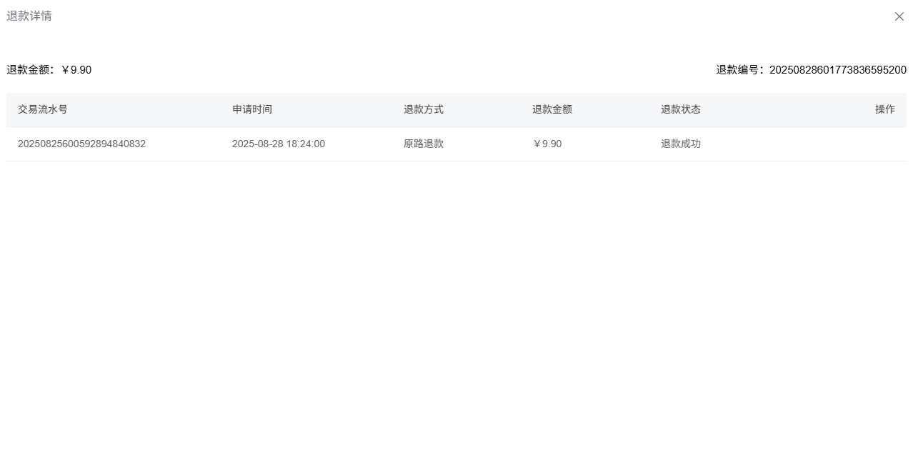 操作:包含"详情"按钮,可查看该笔退款的详细信息。