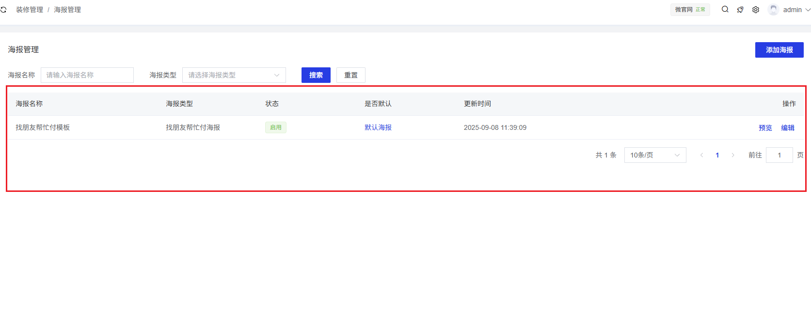 海报管理是用于创建和管理系统中各类海报模板的功能模块,支持自定义海报内容、样式和配置,方便用户生成并分享各类营销和业务场景的海报。
