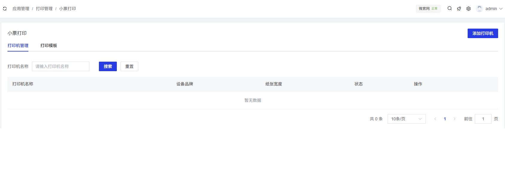 打印管理模块主界面包含两个标签页:打印机管理和打印模板。顶部右侧有对应的操作按钮,下方为搜索区域和数据列表区域。